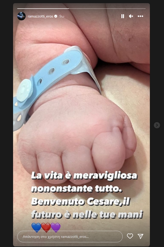 Συγκεκριμένα, δημοσίευσε ένα καρέ με το χεράκι του μωρού και έγραψε στα ιταλικά:Η ζωή είναι υπέροχη! Καλώς ήρθες Cesare, το μέλλον είναι στα χέρια σου”.