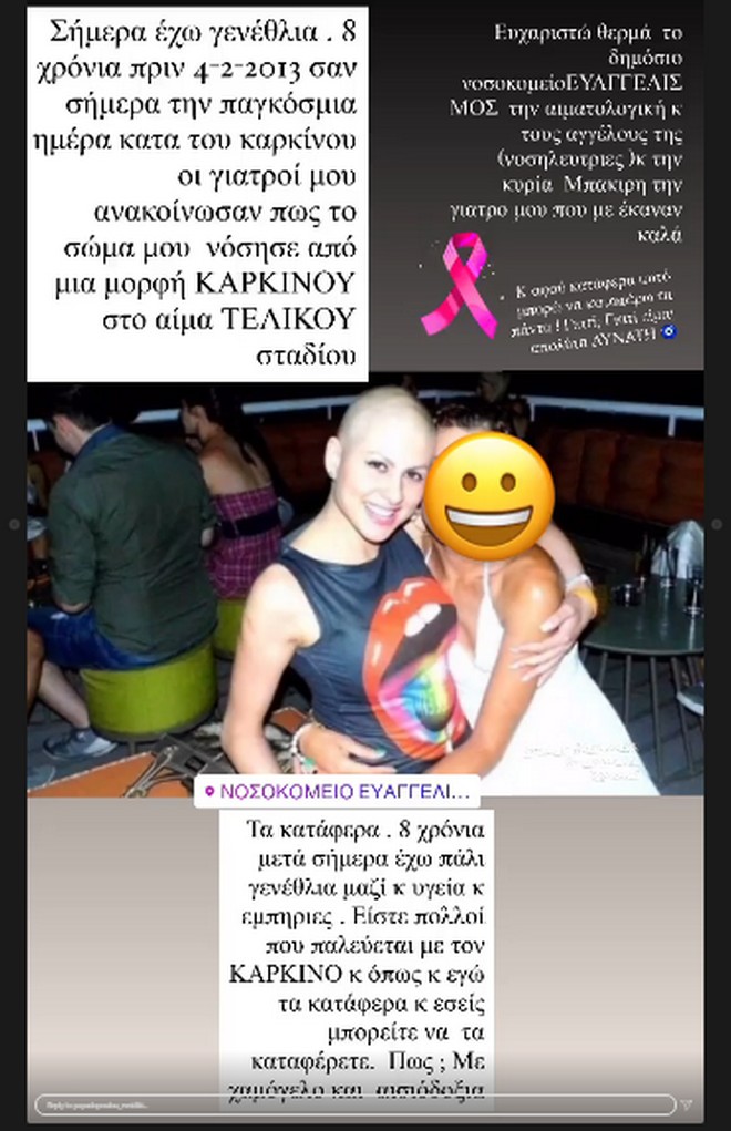 “Σήμερα είναι η Παγκόσμια Ημέρα κατά του καρκίνου. Να εξετάζεστε, ο καρκίνος δεν κοιτάζει ηλικία και εμφάνιση. Ο καρκίνος για μένα ήταν ένα σχολείο”, συμπλήρωσε η ινφλουένσερ, αναρτώντας παράλληλα την παρακάτω φωτογραφία από την περίοδο που νοσούσε.