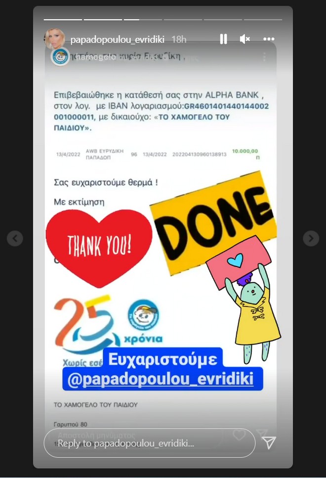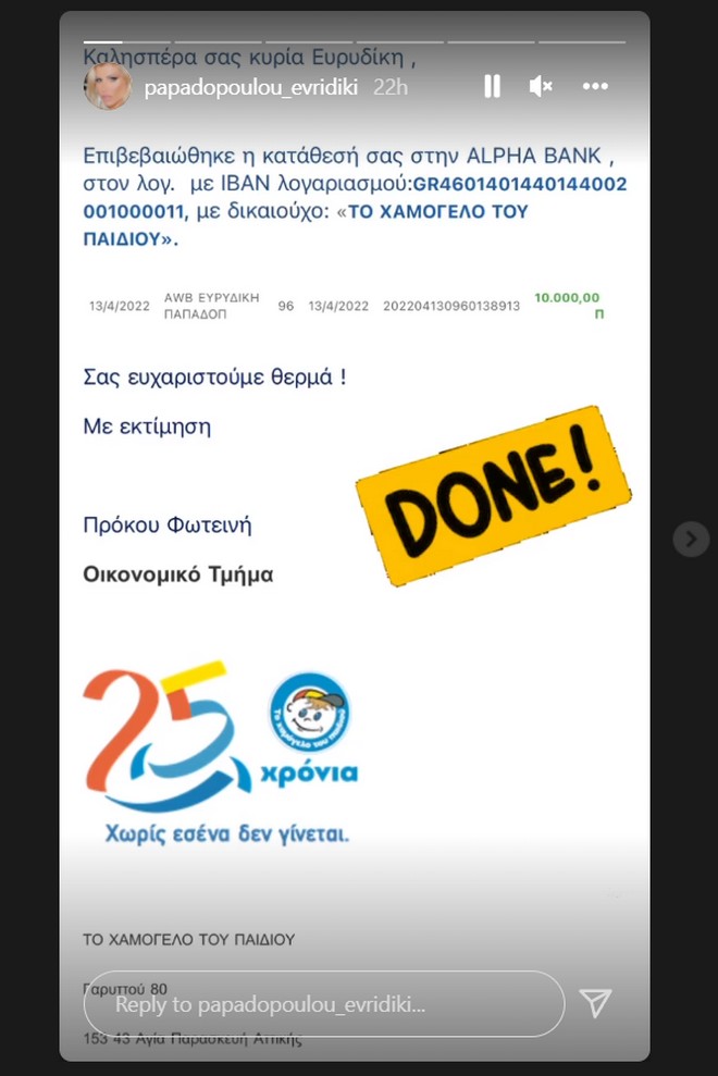 Το γνωστοποίησε η ίδια μέσω του προσωπικού της λογαριασμού στο Instagram, δημοσιεύοντας την επιβεβαίωση της κατάθεσής της, που ανέρχεται στις 10.000 ευρώ.