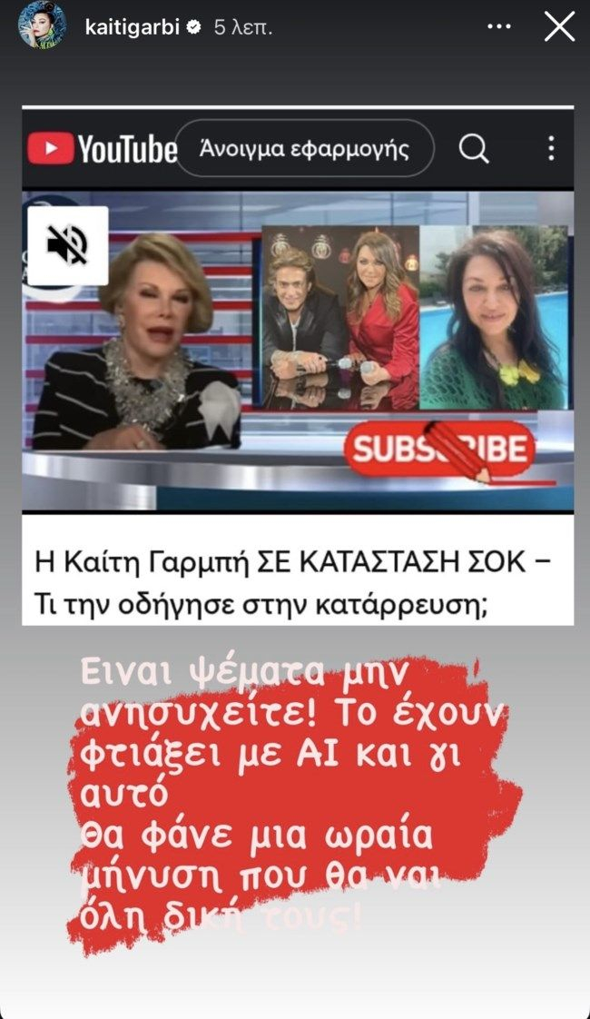 Η Καίτη Γαρμπή θέλησε να ξεκαθαρίσει ότι το συγκεκριμένο βίντεο είναι προϊόν τεχνητής νοημοσύνης και τόνισε ότι θα κινηθεί νομικά. Συγκεκριμένα ανέφερε: “Είναι ψέματα, μην ανησυχείτε! Το έχουν φτιάξει με AI και γι’ αυτό θα φάνε μια μήνυση που θα ‘ναι όλη δική τους!“.