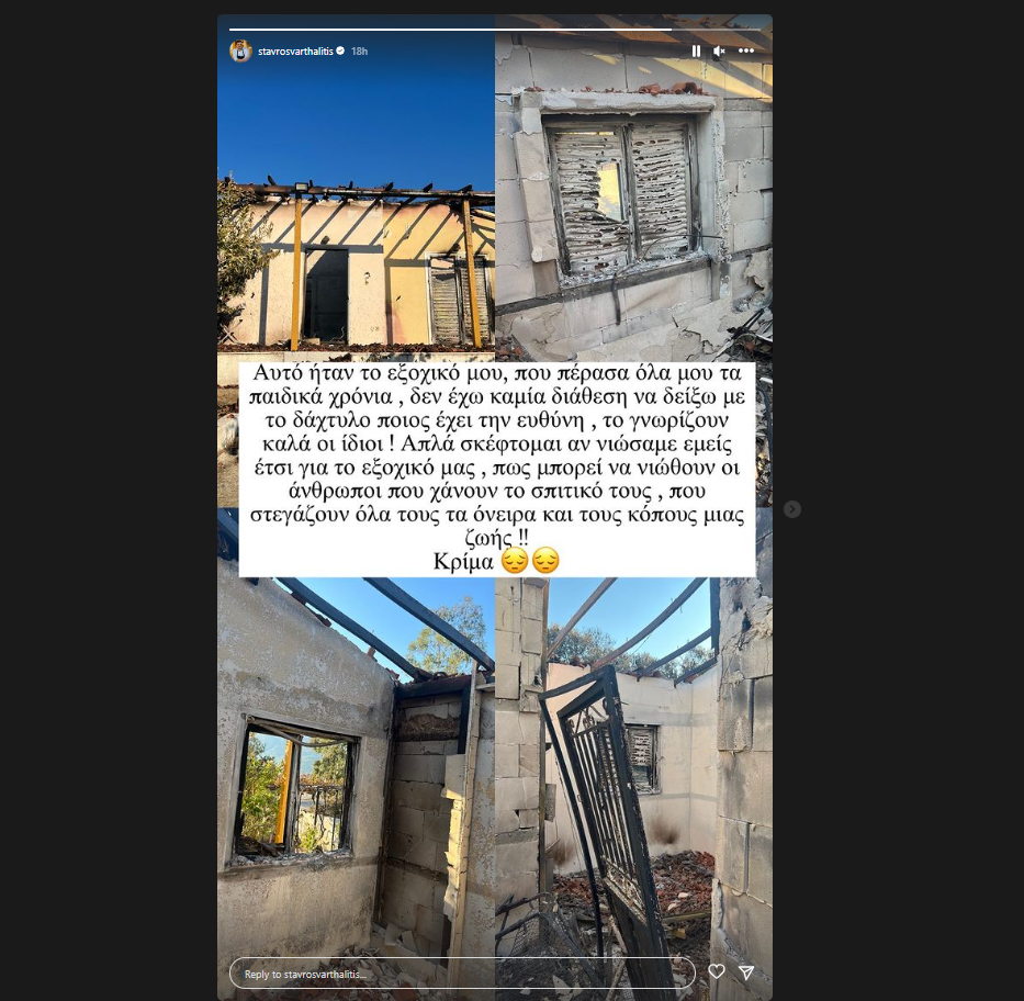 Ο σεφ Σταύρος Βαρθαλίτης ανέβασε στο Instagram ένα κολάζ από φωτογραφίες, για να δείξει τα απομεινάρια του καμένου εξοχικού του, το οποίο τυλίχθηκε στις φλόγες.