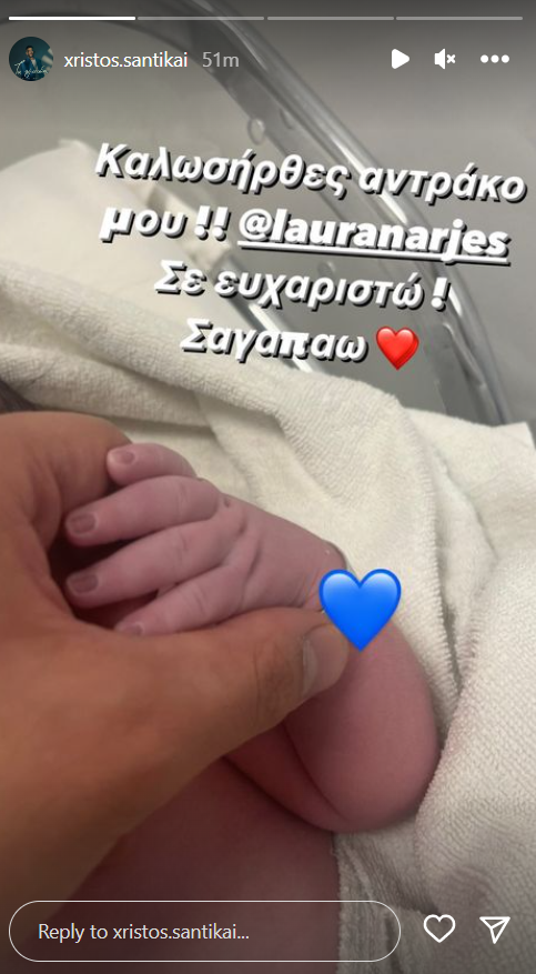 Συγκεκριμένα, ο ίδιος δημοσίευσε μια τρυφερή φωτογραφία, όπου φαίνεται να κρατάει το χέρι του μωρού τους. “Καλώς ήρθες αντράκο μου… Λάουρα Νάργες σε ευχαριστώ, σε αγαπώ”, γράφει ο ίδιος.