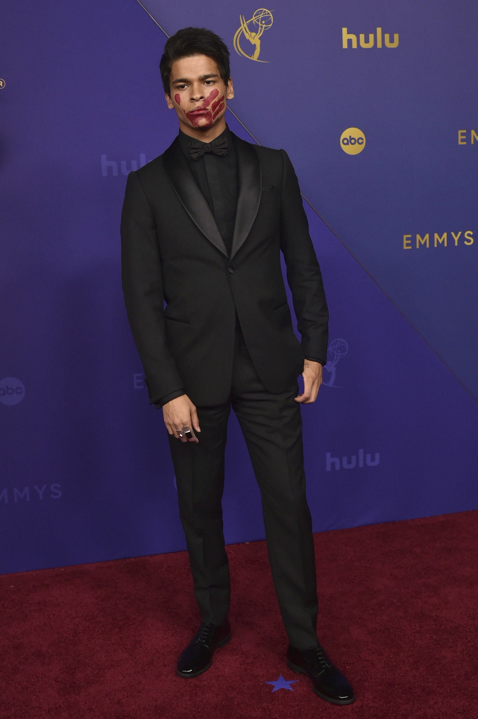 Ο ηθοποιός, ο οποίος ήταν υποψήφιος για το πρώτο του Emmy στην κατηγορία Α’ Ανδρικού Ρόλου για τον ρόλο του Bear Smallhill στο “Reservation Dogs”, περπάτησε στο κόκκινο χαλί φορώντας ένα μαύρο σμόκιν, όμως αυτό που τράβηξε την προσοχή ήταν ένα κόκκινο αποτύπωμα χεριού στο πρόσωπό του.