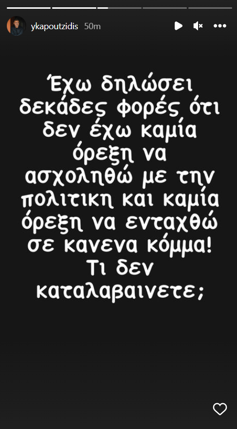 Συγκεκριμένα ο ηθοποιός, παρουσιαστής δήλωσε μέσα από μερικά Stories στην προσωπική του σελίδα στο Instagram πως δεν θέλει να ασχοληθεί με την πολιτική ούτε να ενταχθεί σε κάποιο κόμμα.