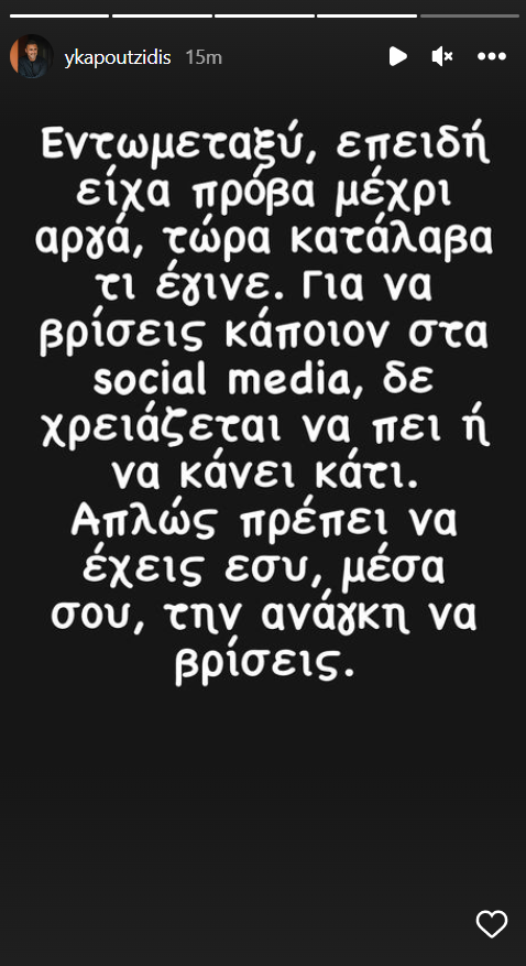 “Εντωμεταξύ, επειδή είχα πρόβα μέχρι αργά, τώρα κατάλαβα τι έγινε. Για να βρίσεις κάποιον στα social media, δεν χρειάζεται να πει ή να κάνει κάτι. Απλώς, πρέπει να έχεις εσύ, μέσα σου, την ανάγκη να τον βρίσεις”, καταλήγει ο ίδιος.