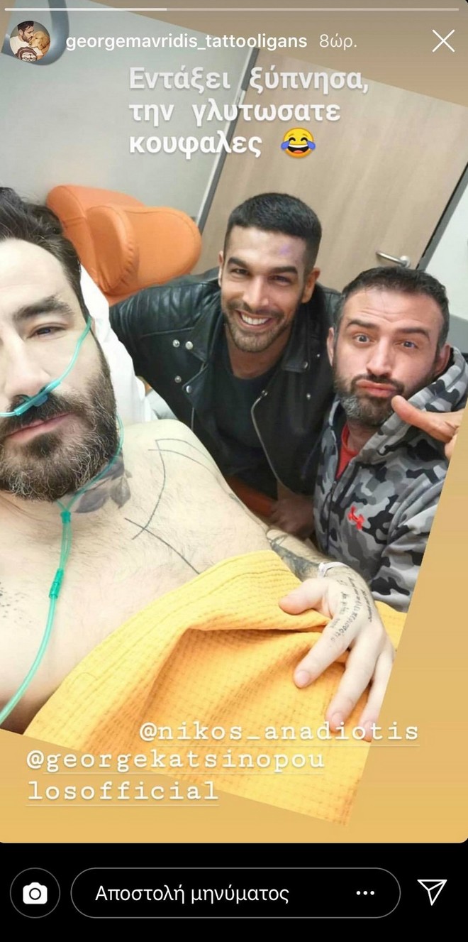 Αν και διασωληνωμένος, ο Γιώργος Μαυρίδης χαμογελά ενώ οι φιλοί του δίπλα κάνουν αστείες γκριμάτσες, ενώ είχε κι ένα μικρό μήνυμα προς τους διαδικτυακούς του “φίλους”: “Εντάξει, ξύπνησα τη γλιτώσατε κουφάλες”.