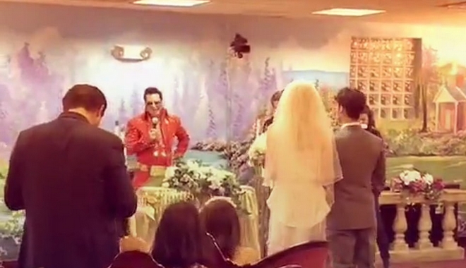 Ήταν μία τυπική, κλασική και... κιτς γαμήλια τελετή εξπρές στο Λας Βέγκας. Κόστισε μόλις 600 δολάρια, αλλά την παράσταση από τους διάσημους νεόνυμφους και τους επίσης διάσημους καλεσμένους τους κατάφερε να κλέψει ένας "σωσίας" του Έλβις Πρίσλεϊ.