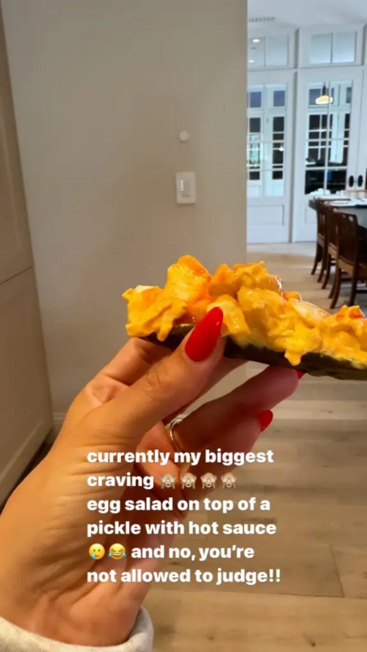Σε ένα Instagram Story η 27χρονη Χέϊλι αποκάλυψε πως έχει λιγούρα για πίκλες με αυγοσαλάτα και καυτερή σάλτσα, φωτογραφίζοντας μάλιστα το δημιουργικό της παρασκεύασμα. Παραδέχθηκε ωστόσο ότι μπορεί να μην ανταποκρίνεται στα γούστα όλων και προειδοποίησε τους θαυμαστές της ότι “δεν επιτρέπεται να κρίνουν”.
