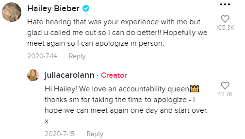 Η Hailey Bieber, σύμφωνα με το dailymail, της είχε απαντήσει εκείνη την περίοδο σε σχόλιο, στο συγκεκριμένο βίντεο ζητώντας της δημόσια συγγνώμη.