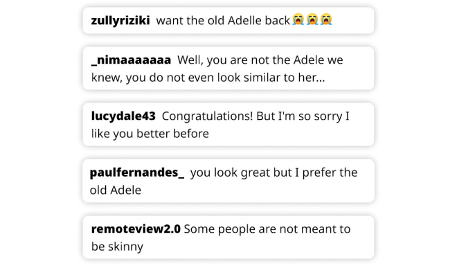 “Λοιπόν δεν είσαι η Adele που ξέραμε, δεν μοιάζεις καν με αυτήν”, “Θέλουμε την παλιά Adele πίσω” “Μερικοί άνθρωποι απλώς δεν προορίζονταν να είναι αδύνατοι”.