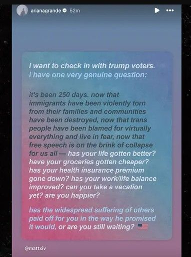Έχουν φθηνύνει τα τρόφιμα; Έχει μειωθεί το ασφάλιστρο της ασφάλειας υγείας σας; Έχει βελτιωθεί η ισορροπία μεταξύ εργασίας και προσωπικής ζωής; Μπορείτε να πάτε διακοπές; Είστε πιο ευτυχισμένοι; Η ευρεία ταλαιπωρία των άλλων σας έχει αποζημιώσει όπως σας είχε υποσχεθεί, ή ακόμα περιμένετε;”, έγραφε χαρακτηριστικά η ανάρτηση της Ariana Grande.