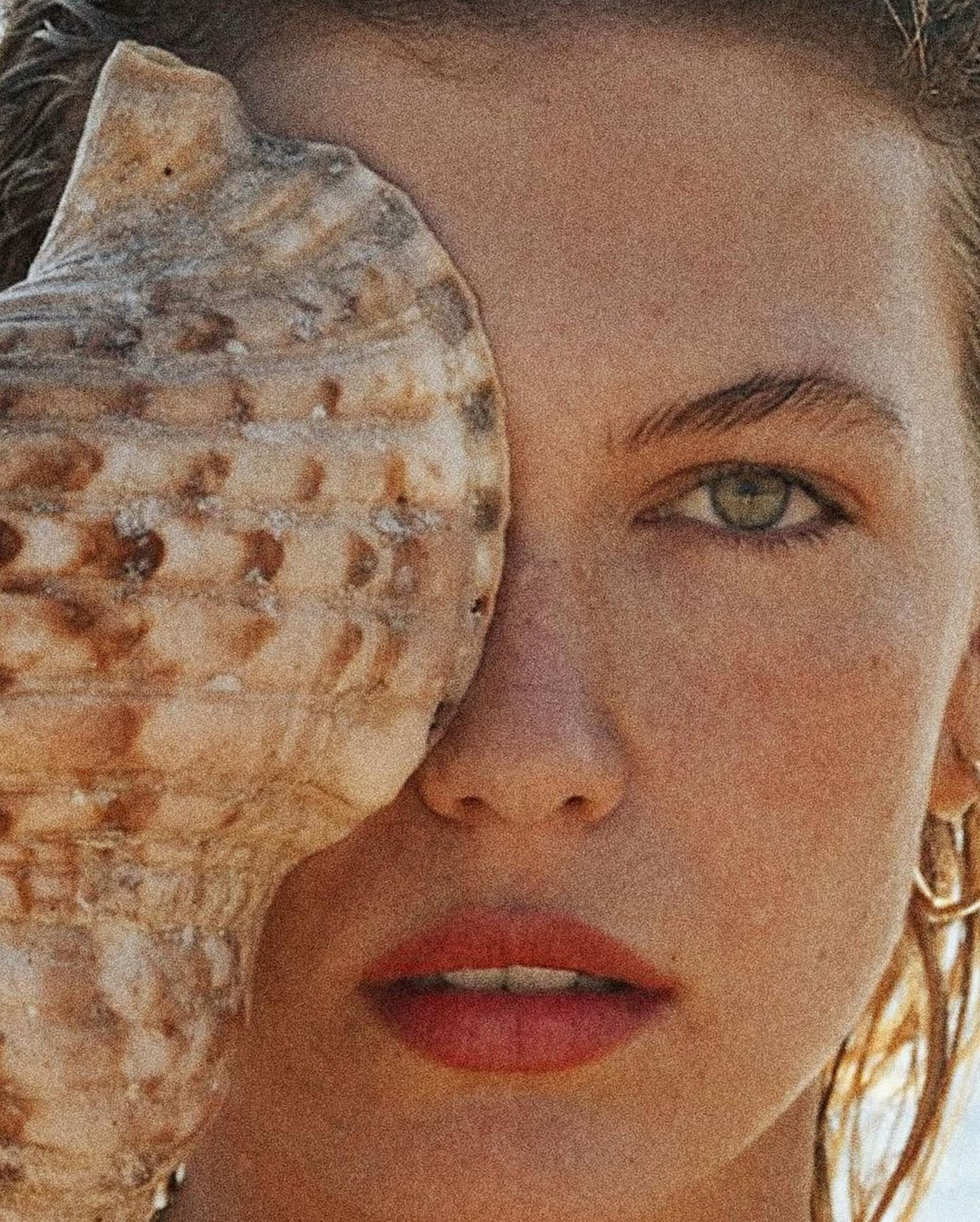 Οι φωτογραφίες που έκλεψαν την παράσταση, όμως, ήταν εκείνες με τις οποίες πόζαρε στη θάλασσα μαζί με ένα μεγάλο κοχύλι, με τα κοντινά καρέ στο πρόσωπό της να είναι εκπληκτικά.