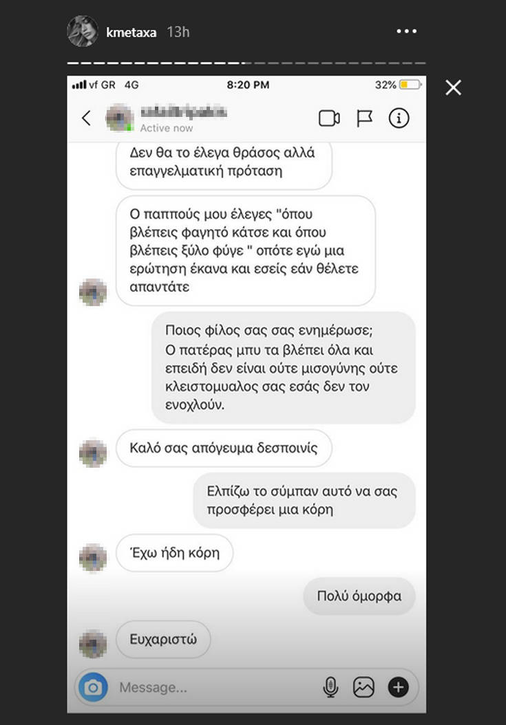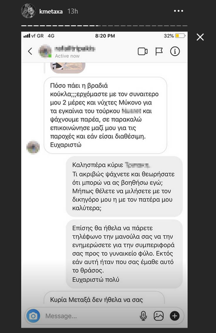 Ξέσπασε η Κόνι Μεταξά. Η κόρη του Λευτέρη Πανταζή αποφάσισε να βγάλει σε story στο Instagram ολόκληρο διάλογο που είχε με άνδρα που της έκανε ανήθικη πρόταση.
