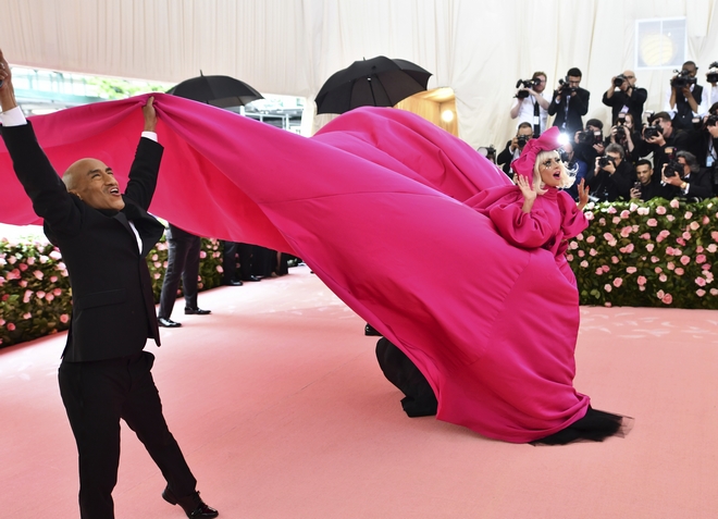 Η Lady Gaga παρουσίασε τέσσερις θεατρικές πράξεις στο κόκκινο χαλί. Έφτασε με ένα τεραστίων διαστάσεων, ζεστό ροζ Brandon Maxwell φόρεμα συνοδευόμενη από ένα προσωπικό από τουλάχιστον έξι άνδρες και γυναίκες που κρατούσαν ομπρέλες. Ανύψωσαν το φόρεμά της για να αποκαλύψουν μία μαύρη τουαλέτα. Και έπειτα ένα άλλο φόρεμα! Και ένα άλλο! Και ένα άλλο! Και τελικά εμφανίστηκε με τα εσώρουχά της.
