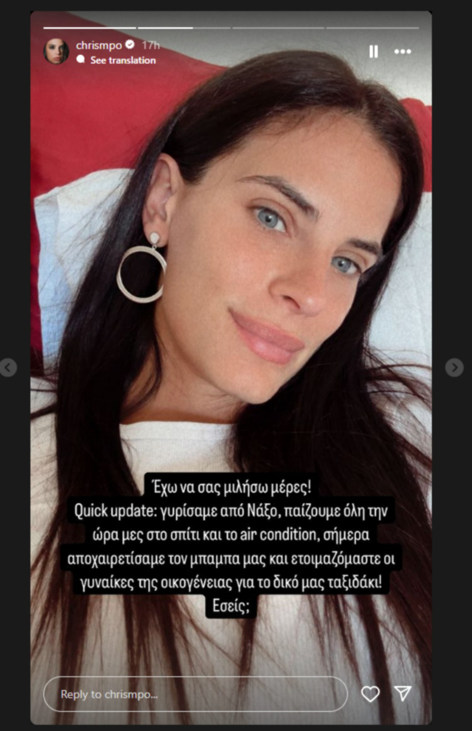 Όπως αποκάλυψε αργότερα σε story της: “Γυρίσαμε από Νάξο, παίζουμε όλη την ώρα μέσα στο σπίτι και το air condition, αποχαιρετίσαμε τον μπαμπά μας και ετοιμαζόμαστε οι γυναίκες της οικογένειας για το δικό μας ταξιδάκι”.