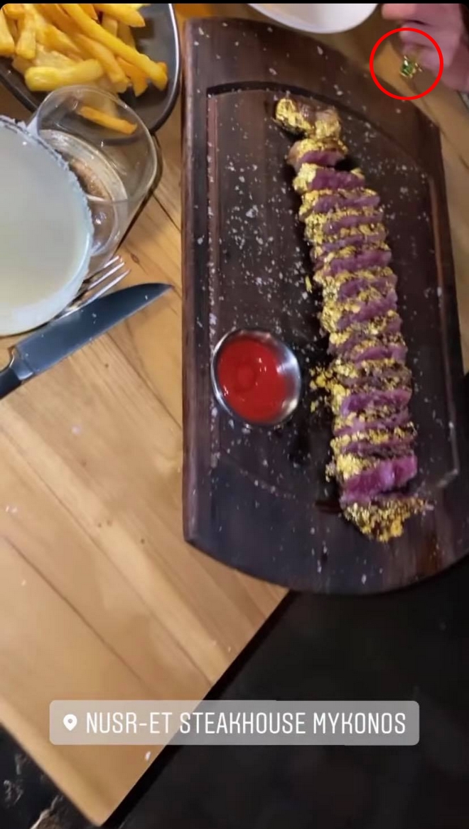 Ειδικότερα, το βράδυ της Δευτέρας, ο διάσημος τράπερ ανέβασε ένα στόρι στο Instagram από το εστιατόριο του διάσημου σεφ, Νουσρέτ. Στην ανάρτηση αυτή, όπου προβάλλει την μπριζόλα που παρήγγειλε, φαίνεται για λίγο ένα γυναικείο χέρι που φορά ένα χρυσό δαχτυλίδι με πράσινη πέτρα.