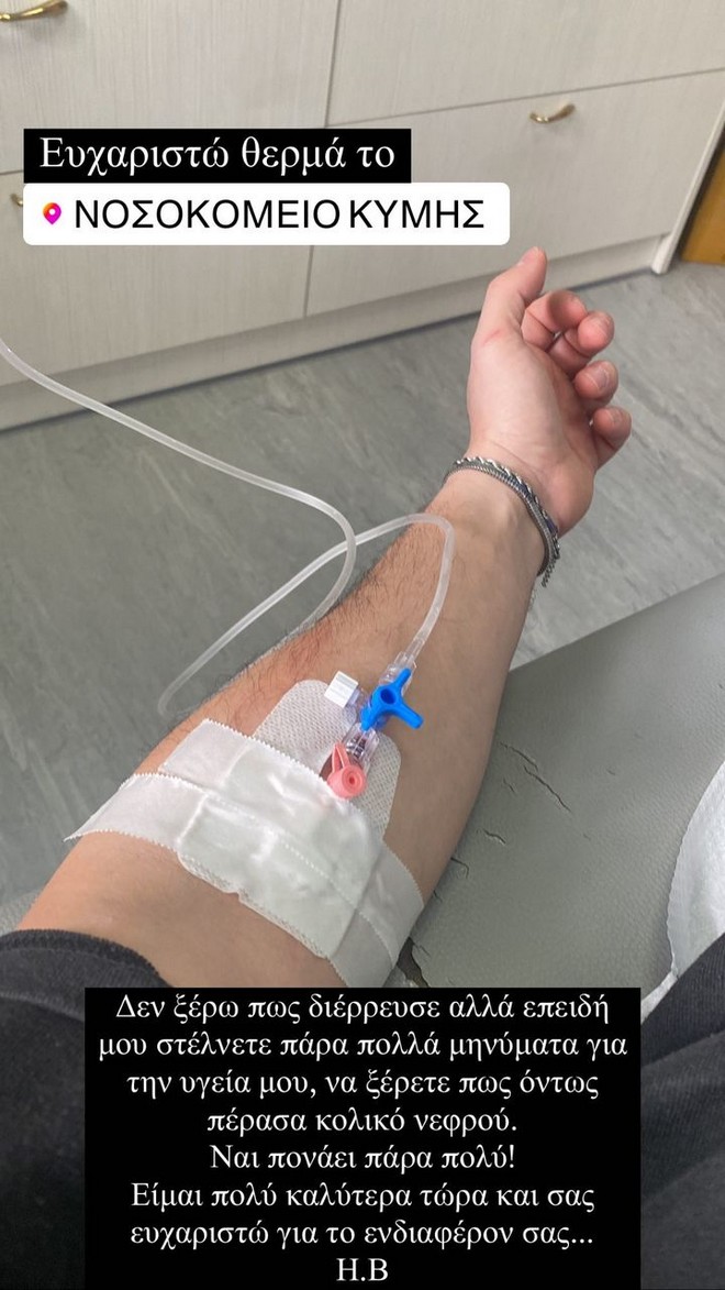“Ευχαριστώ θερμά το νοσοκομείο Κύμης! Δεν ξέρω πως διέρρευσε αλλά επειδή μου στέλνετε πάρα πολλά μηνύματα για την υγεία μου, να ξέρετε πως όντως πέρασα κολικό νεφρού. Ναι πονάει πάρα πολύ! Είμαι πολύ καλύτερα τώρα και σας ευχαριστώ για το ενδιαφέρον σας”, έγραψε χαρακτηριστικά.