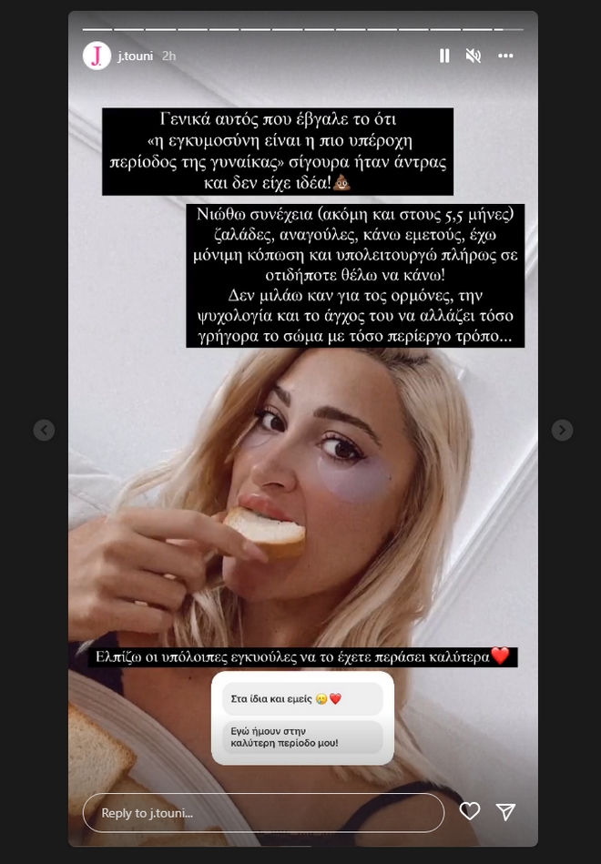 Σε πρόσφατη ανάρτηση στα stories της στο Instagram, η διάσημη influencer γνωστοποίησε με νέο βίντεο ότι περνάει δύσκολα, καθώς έχει αναγούλες και εμετούς, καθώς και ψυχολογικές διακυμάνσεις.