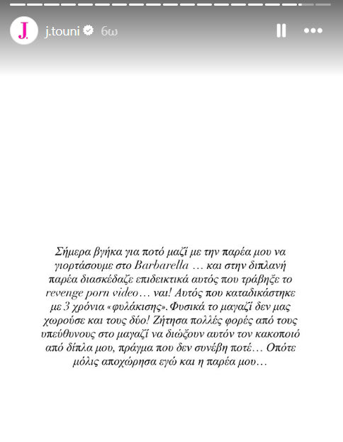 «Σήμερα βγήκα για ποτό μαζί με την παρέα μου να γιορτάσουμε και στη διπλανή παρέα διασκέδαζε επιδεικτικά αυτός που τράβηξε το revenge porn video… Ναι! Αυτός που καταδικάστηκε με 3 χρόνια «φυλάκισης». Φυσικά το μαγαζί δεν μας χωρούσε και τους δύο! Ζήτησα πολλές φορές από τους υπεύθυνους στο μαγαζί να διώξουν αυτόν τον κακοποιό από δίπλα μου, πράγμα που δεν συνέβη ποτέ… Οπότε μόλις αποχώρησα εγώ και η παρέα μου…».