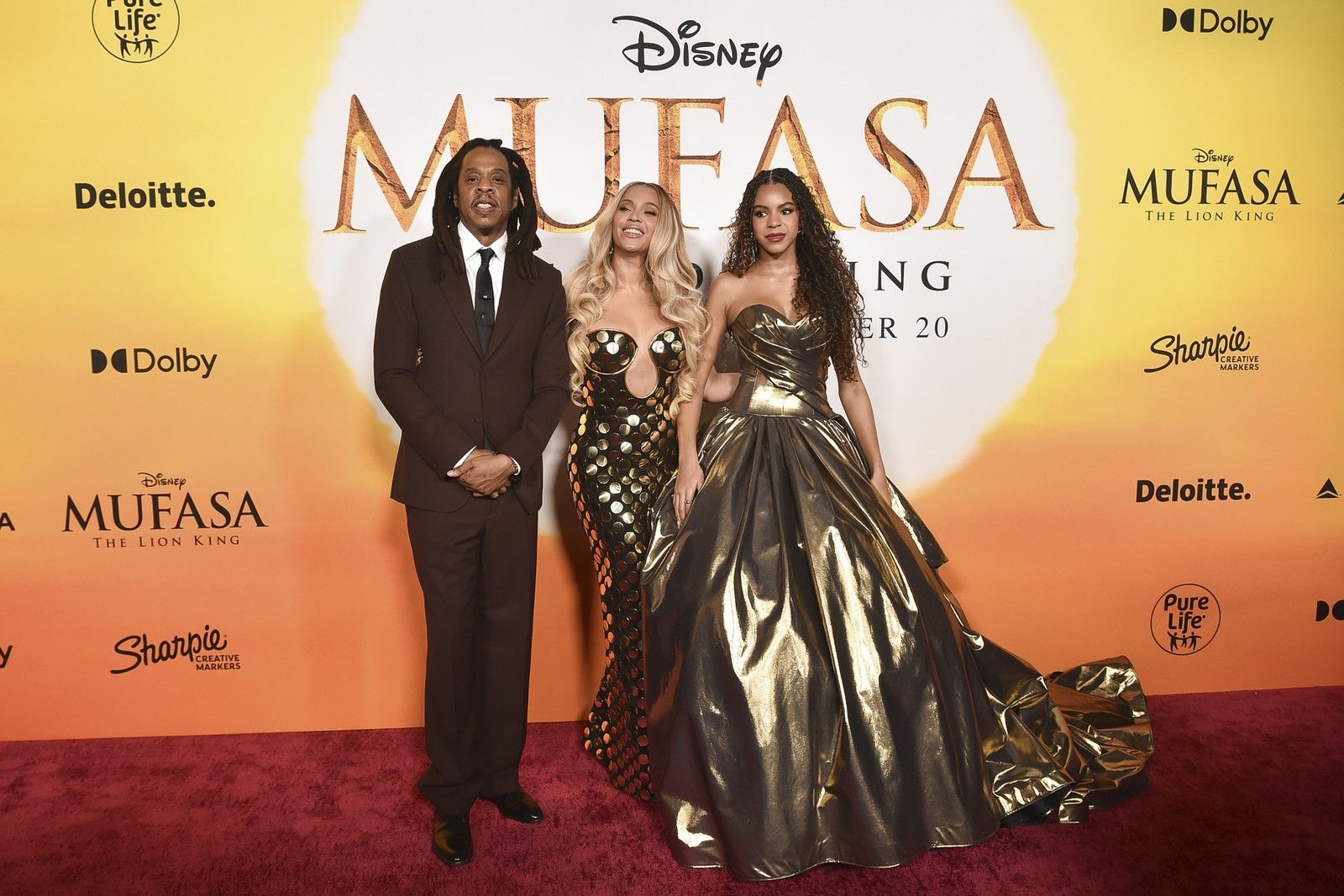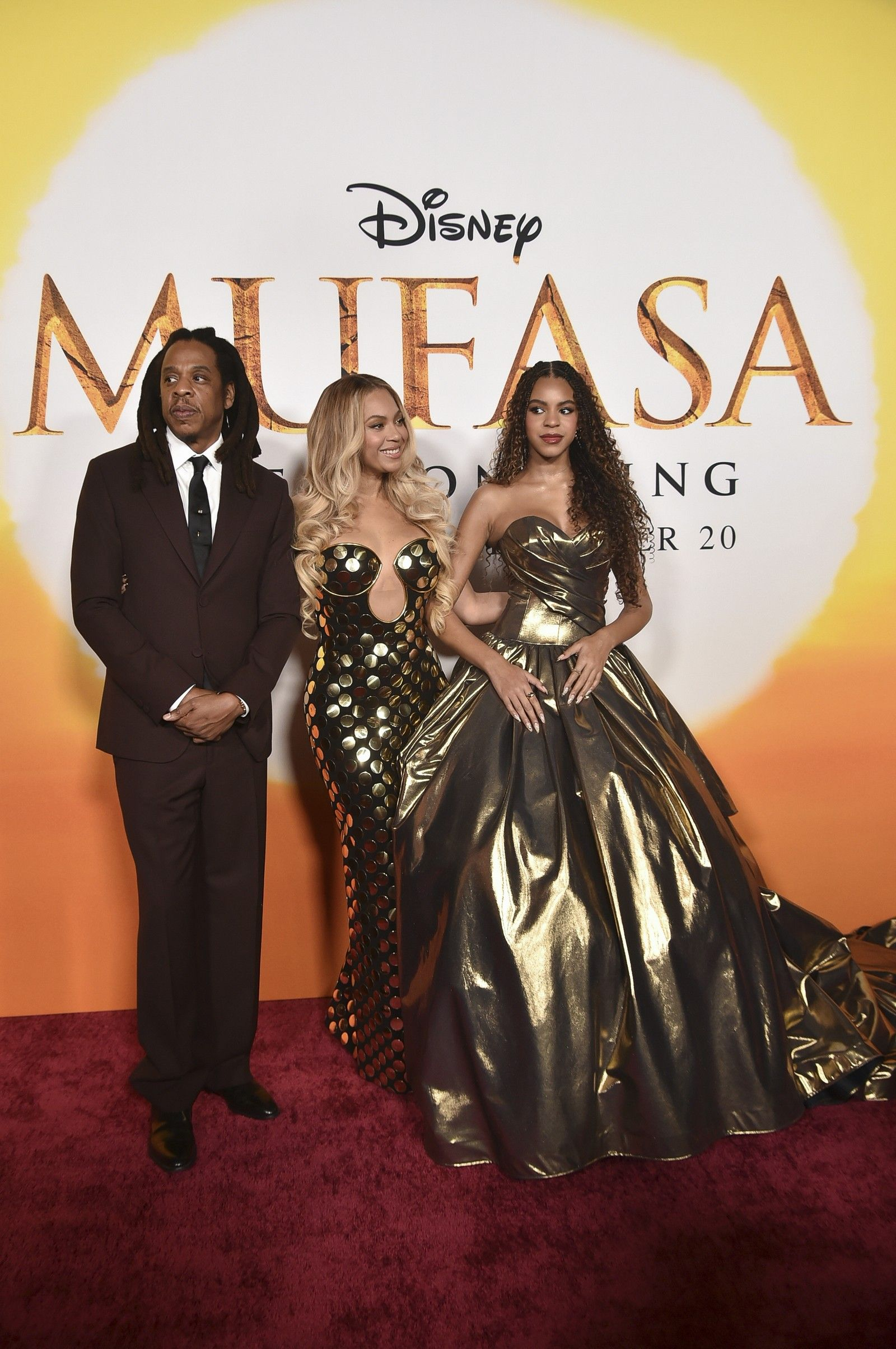 Jay-Z, from left, Beyoncé and Blue Ivy Carter arrive at the premiere of "Mufasa: The Lion King" on Monday, Dec. 9, 2024, at the Dolby Theatre in Los Angeles. (Photo by Richard Shotwell/Invision/AP)