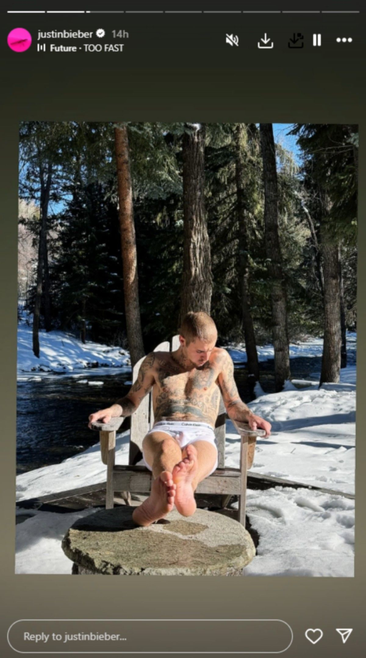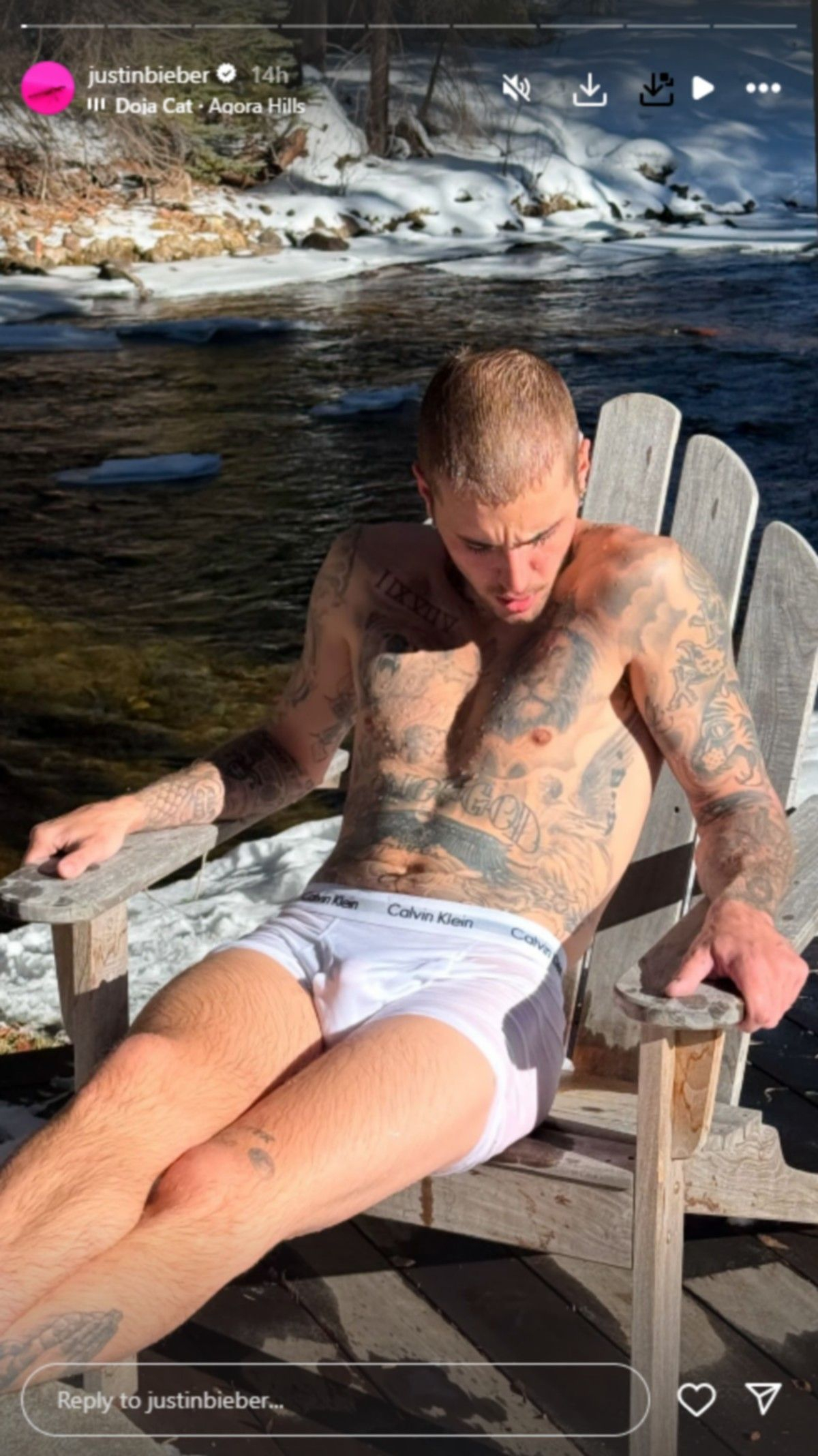 Στις φωτογραφίες, που φαίνεται να τραβήχτηκαν αφότου ο ίδιος έκανε μία βουτιά στα παγωμένα νερά ενός ποταμιού, ο Τζάστιν Μπίμπερ χαλαρώνει σε μία ξύλινη καρέκλα με φόντο το χιονισμένο σκηνικό του Άσπεν, ενώ έχει απλωμένα τα πόδια του σε ένα πέτρινο τραπέζι.