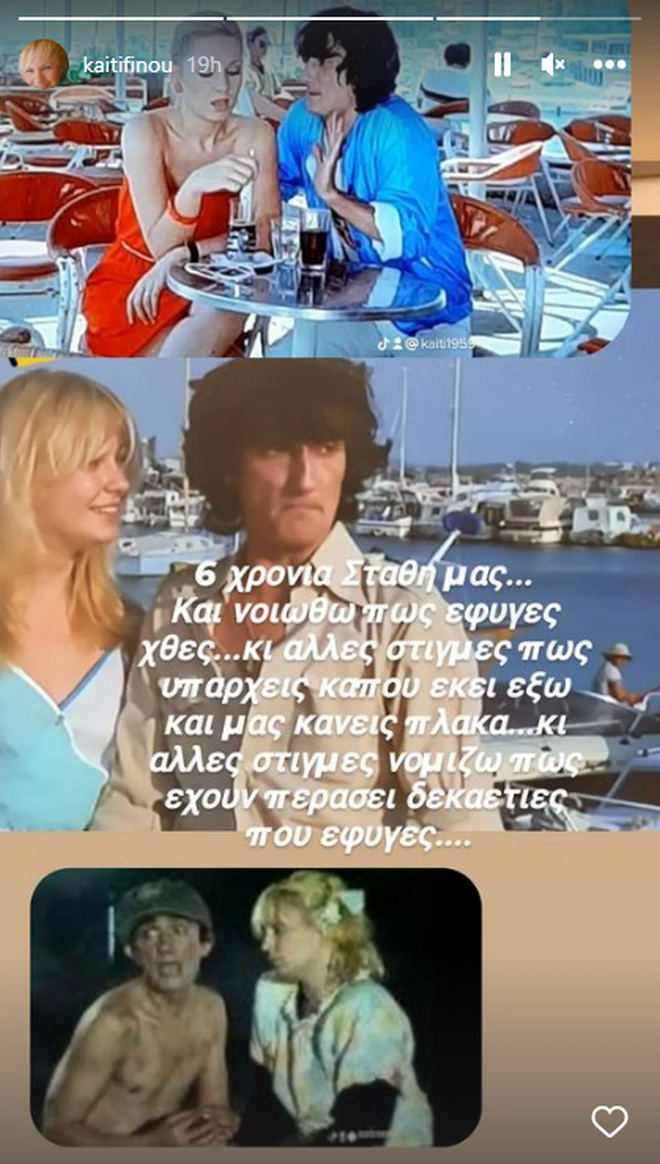 Η Καίτη Φίνου δημοσίευσε κι άλλα στιγμιότυπα μέσω story στον προσωπικό της λογαριασμό, τα οποία και συνόδευε με το εξής μήνυμα: 6 χρόνια Στάθη μας. Και νιώθω πως έφυγες χθες. Κι άλλες στιγμές πως υπάρχεις κάπου εκεί έξω και μας κάνεις πλάκα. Κι άλλες στιγμές, νομίζω πως έχουν περάσει δεκαετίες που έφυγες”.