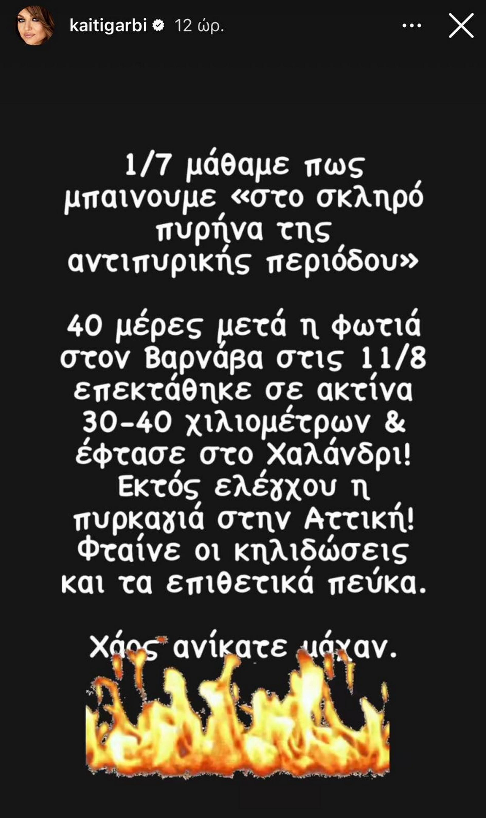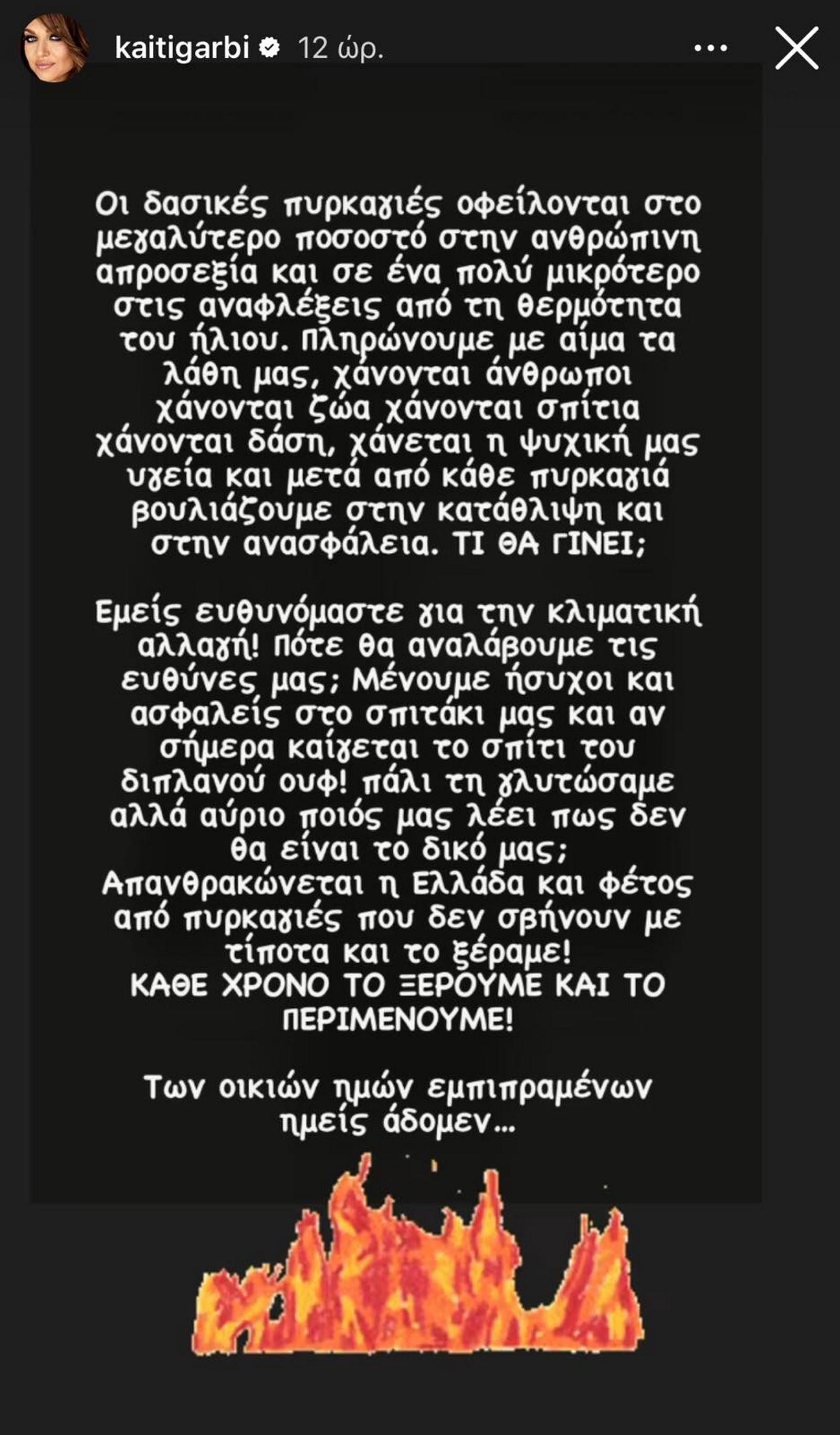 Ξέσπασε μέσα από αναρτήσεις της στα social η Καίτη Γαρμπή αναφορικά με τη μεγάλη πυρκαγιά που μαίνεται για τρίτη μέρα σήμερα στη βορειοανατολική Αττική. Μέσα από τον λογαριασμό της στο Instagram η δημοφιλής τραγουδίστρια κάλεσε τους ιθύνοντες να αναλάβουν τις ευθύνες τους και αναφέρθηκε στις ανθρώπινες ζωές και στα ζώα που χάνονται στις φλόγες: «Φταίνε οι κηλιδώσεις και τα επιθετικά πεύκα. Χάος ανίκατε μάχαν» αναφέρει μεταξύ άλλων.