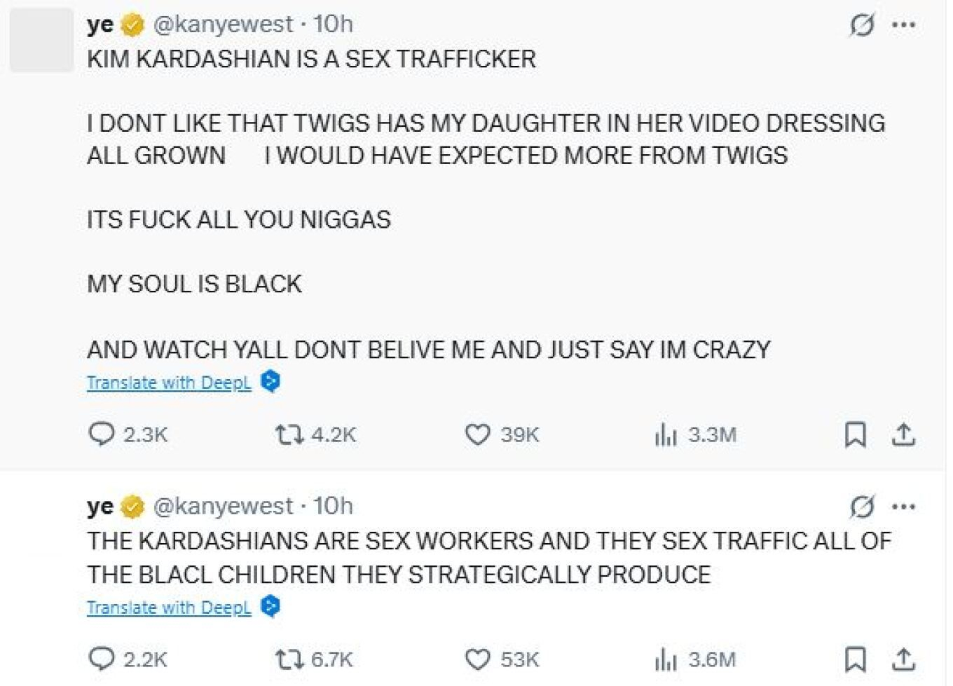 «Η Κιμ Καρντάσιαν είναι μαστροπός», γράφει σε πρώτη του ανάρτηση, ενώ στη συνέχεια, αναφέρεται στην FKA Twigs. «Δεν μου αρέσει που η Twigs έχει την κόρη μου στο βίντεό της να ντύνεται σαν ενήλικη. Θα περίμενα κάτι καλύτερο από την Twigs. Άντε γαμ***** μαύροι. Η ψυχή μου είναι μαύρη. Και σας βλέπω όλους να μη με πιστεύετε και να λέτε ότι είμαι τρελός», συνέχισε.