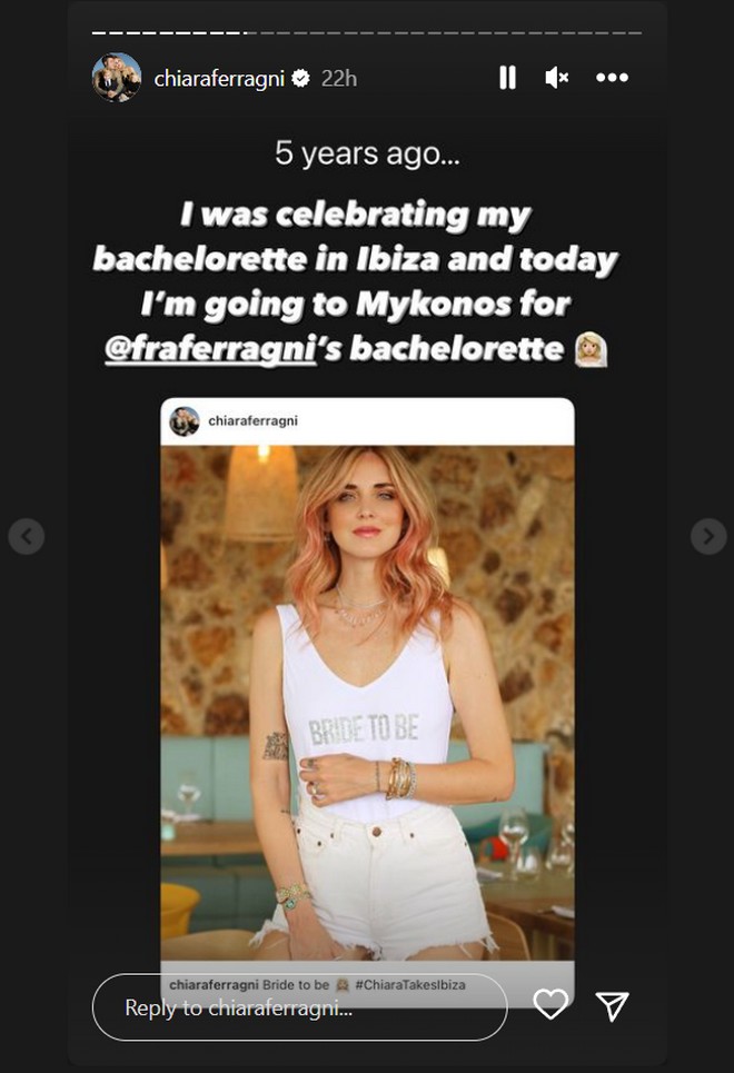 Η διάσημη επιχειρηματίας και fashion blogger, που μετρά σχεδόν 30 εκατομμύρια ακόλουθους στο Instagram, έκανε γνωστή την επίσκεψή της στο “νησί των ανέμων”, αρχικά με ένα story, στο οποίο μοιράστηκε μια φωτογραφία από το δικό της bachelorette, 5 χρόνια πριν. “Γιόρταζα το δικό μου bachelorette στην Ίμπιζα και τώρα πάω στη Μύκονο για το bachelorette της Φραντσέσκα” έγραψε χαρακτηριστικά.