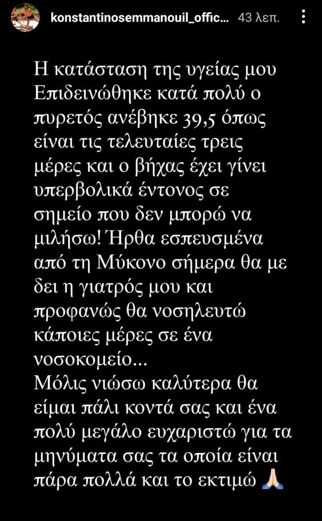 “Η κατάσταση της υγείας μου επιδεινώθηκε κατά πολύ. Ο πυρετός ανέβηκε 39,5 όπως είναι τις τελευταίες τρεις ημέρες και ο βήχας έχει γίνει υπερβολικά έντονος σε σημείο που δεν μπορώ να μιλήσω. Ήρθα εσπευσμένα από τη Μύκονο σήμερα. Θα με δει η γιατρός μου και προφανώς θα νοσηλευτώ κάποιες ημέρες σε ένα νοσοκομείο. Μόλις νιώσω καλύτερα θα είμαι και πάλι κοντά σας και ένα πολύ μεγάλο ευχαριστώ για τα μηνύματά σας τα οποία είναι πάρα πολλά και το εκτιμώ”, έγραψε χαρακτηριστικά ο Κωνσταντίνος Εμμανουήλ.