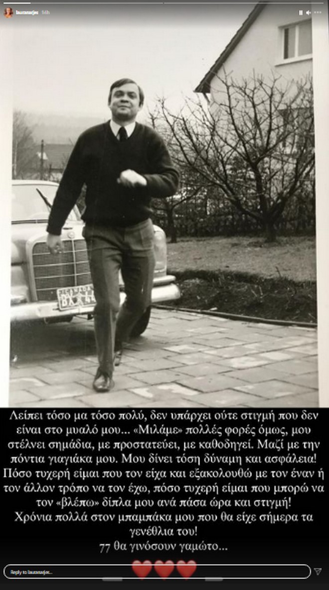 “Λείπει τόσο μα τόσο πολύ… δεν υπάρχει στιγμή που δεν είναι στο μυαλό μου… «Μιλάμε» πολλές φορές, όμως μου στέλνει σημάδια, με προστατεύει, με καθοδηγεί. Μαζί με την πόντια γιαγιάκα μου. Μου δίνει τόση δύναμη και ασφάλεια. Πόσο τυχερή είναι που τον είχα και εξακολουθώ με τον έναν ή τον άλλον τρόπο να τον έχω, πόσο τυχερή είμαι που μπορώ να τον «βλέπω» δίπλα μου ανά πάσα ώρα και στιγμή! Χρόνια πολλά στον μπαμπάκα μου που θα είχε σήμερα τα γενέθλιά του”, έγραψε η Λάουρα Νάργες.