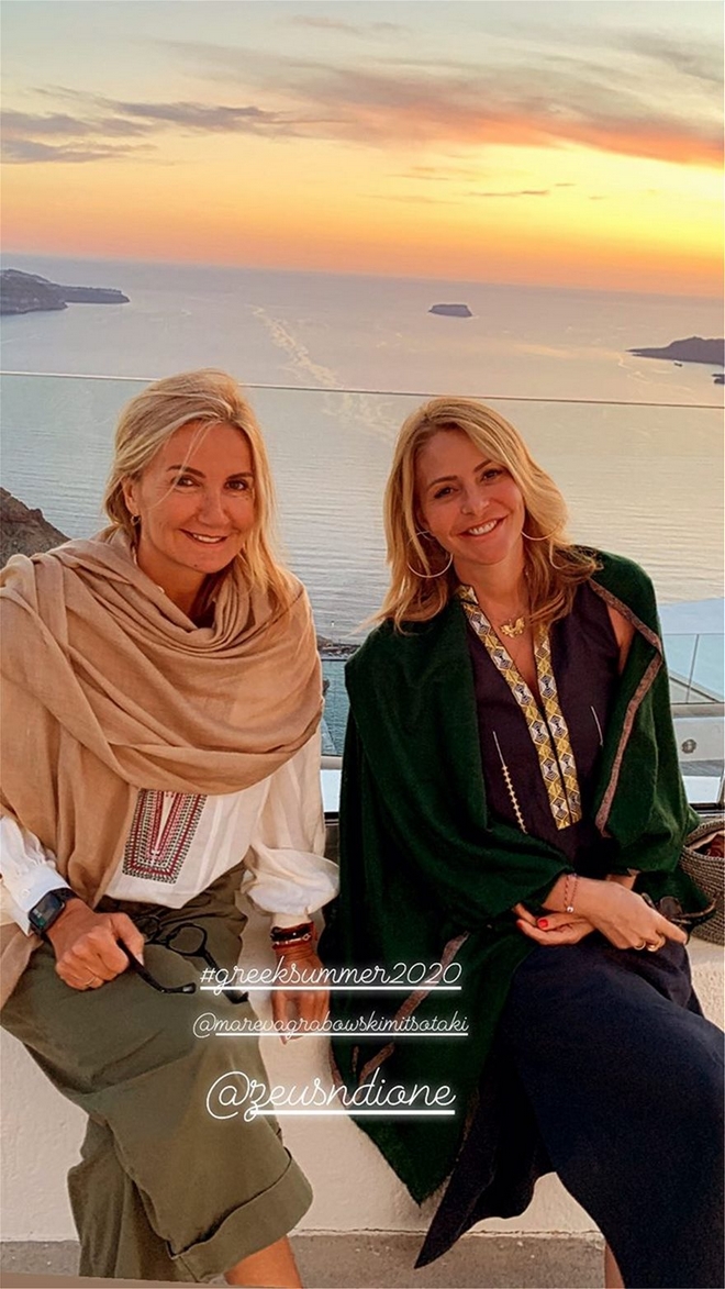 Μαρέβα Μητσοτάκη και Τζένη Μπαλατσινού με φόντο το ηλιοβασίλεμα της Σαντορίνης