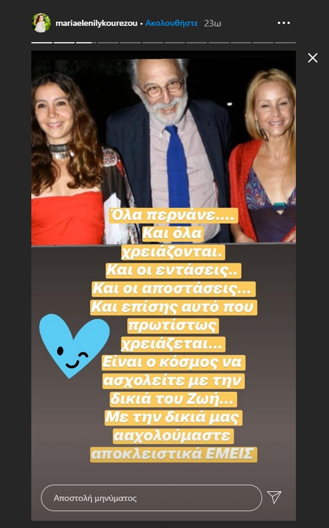 “Όλα περνάνε και όλα χρειάζονται. Και οι εντάσεις…Και οι αποστάσεις… Και επίσης αυτό που πρωτίστως χρειάζεται είναι ο κόσμος να ασχολείται με τη δικιά του Ζωή. Με τη δικιά μας ασχολούμαστε αποκλειστικά ΕΜΕΙΣ”.