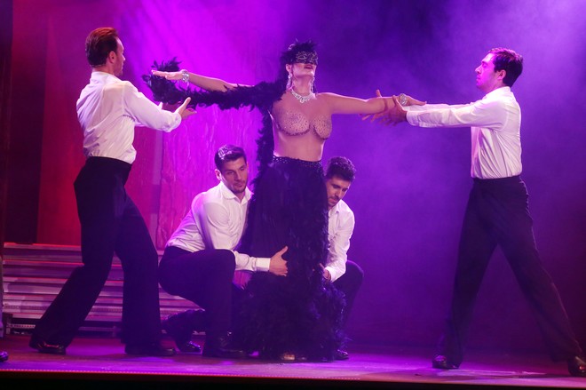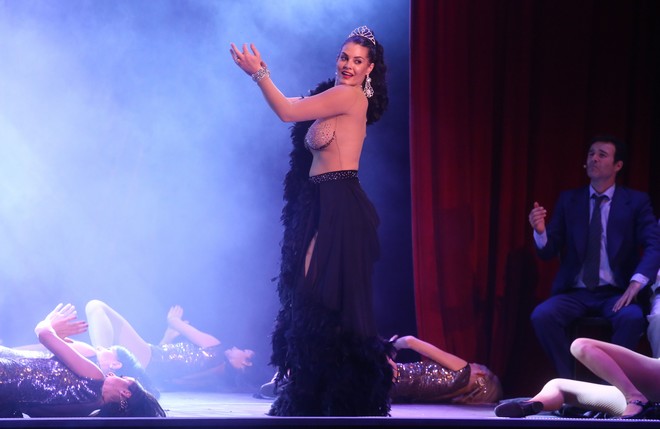 Ειδικότερα, προς το τέλος της παράστασης, η Μαρία Κορινθίου εμφανίζεται με ένα κοστούμι που δίνει την αίσθηση ότι είναι εντελώς διάφανο και μοιάζει σαν να αποκαλύπτει το στήθος της.