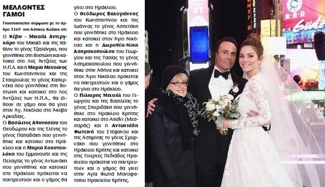 Αυτό όμως που δεν είναι καθόλου γνωστό είναι ότι ο γάμος της που θα έχει έντονο… άρωμα Κρήτης. Κατ΄αρχήν η αναγγελία του χαρμόσυνου γεγονότος της δημοσιεύτηκε σήμερα στην κρητική εφημερίδα Πατρίς: «O Κέβιν – Μιχαήλ Αντεργκάρο του Μικαέλ και της Κάθλιν το γένος Τζιαλόνγκο, που γεννήθηκε στη Βοστόνη και κατοικεί στο Λος Άντζελες των ΗΠΑ και η Μαρία Μενούνος του Κωνσταντίνου και της Σταυρούλας το γένος Καπερνέκα που γεννήθηκε στη Βοστόνη και κατοικεί στο Λος Άντζελες των ΗΠΑ, θα έλθουν σε γάμο που θα γίνει στον Άγ. Νικόλαο στο Άκοβο Αρκαδίας» γράφει η σχετική αναγγελία.