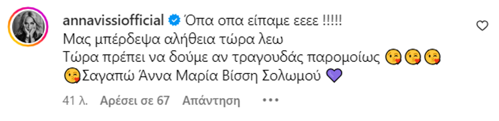Την επιτυχημένη μεταμόρφωση δεν θα μπορούσε να μην σχολιάσει και η ίδια η Άννα Βίσση, η οποία αστειευόμενη έγραψε πως μένει να φανεί αν η Μαρία Σολωμού τραγουδάει και σαν εκείνη.