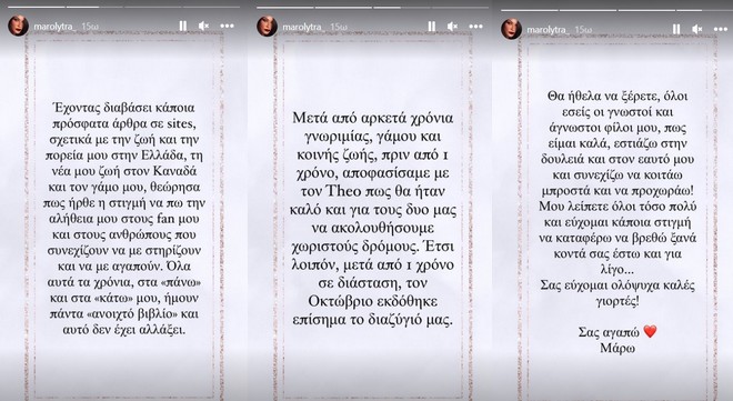 Θα ήθελα να ξέρετε όλοι, εσείς οι γνωστοί και οι άγνωστοι φίλοι μου, πως είμαι καλά, εστιάζω στη δουλειά και τον εαυτό μου και συνεχίζω να κοιτάω μπροστά και να προχωράω. Μου λείπετε όλοι τόσο και εύχομαι κάποια στιγμή να καταφέρω να βρεθώ ξανά κοντά σας έστω και για λίγο. Σας εύχομαι ολόψυχα καλές γιορτές. Σας αγαπώ. Μάρω», έγραψε η Μάρω Λύτρα.