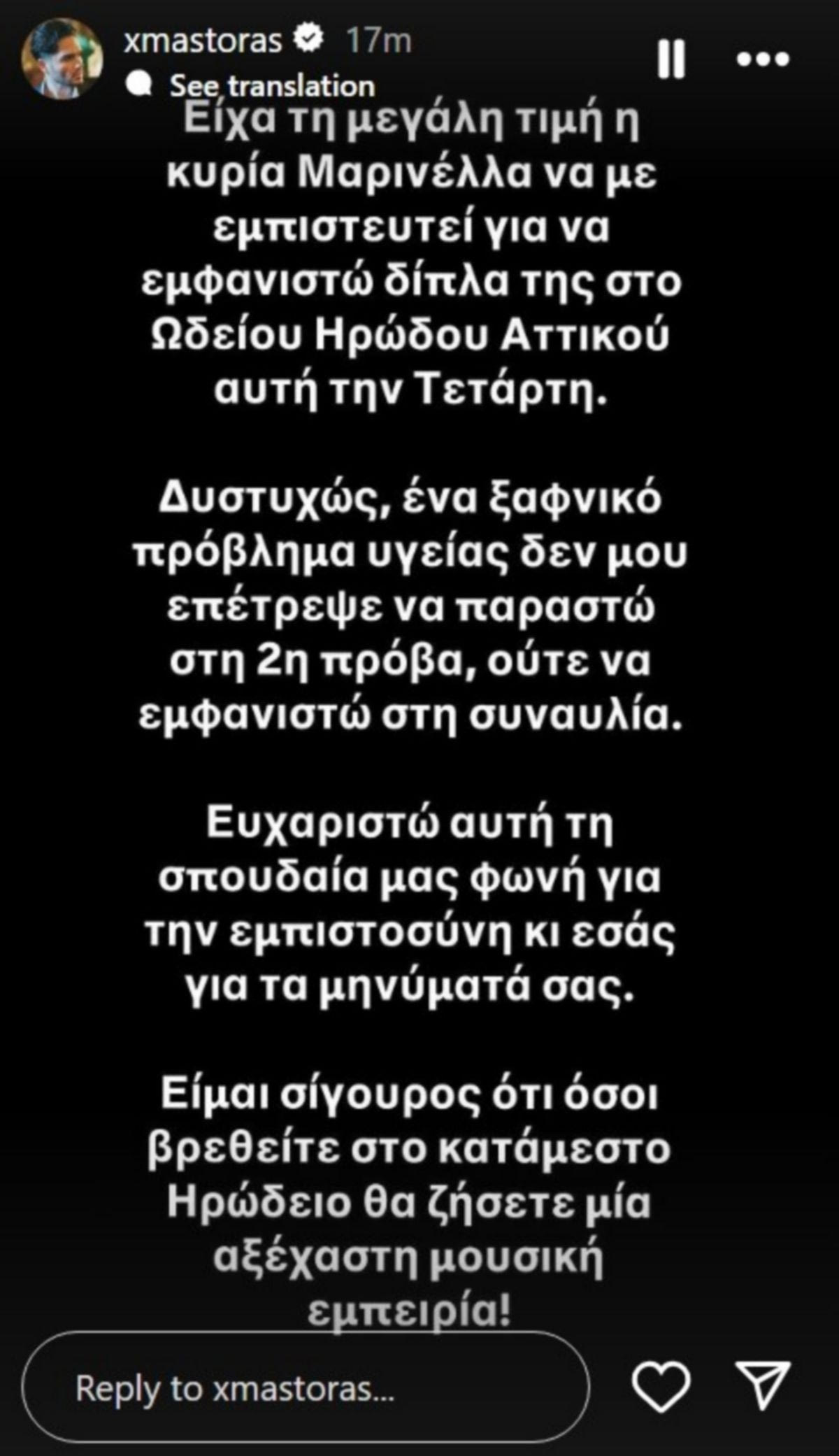 Η πρώτη δήλωση του Χρήστου Μάστορα μετά την απομάκρυνσή του από τη συναυλία της Μαρινέλλας και τις φήμες για μεταξύ τους διαμάχη.