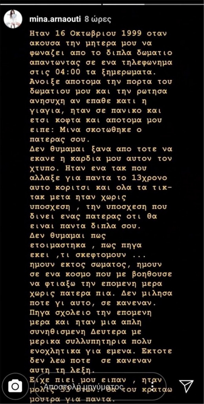 “Ήταν 16 Οκτωβρίου 1999 όταν άκουσα την μητέρα μου να φωνάζει από το δίπλα δωμάτιο απαντώντας σε ένα τηλεφώνημα στις 04:00 τα ξημερώματα. Άνοιξε απότομα την πόρτα του δωματίου μου και την ρώτησα ανήσυχη αν έπαθε κάτι η γιαγιά, ήταν σε πανικό και έτσι κοφτά και απότομα μου είπε: Μίνα σκοτώθηκε ο πατέρας σου. Δεν θυμάμαι ξανά από τότε να έκανε η καρδιά μου αυτόν τον χτύπο. Ήταν ένα τακ που άλλαξε για πάντα το 13χρονο αυτό κορίτσι και όλα τα τικ-τακ μετά ήταν χωρίς υπόσχεση, την υπόσχεση που δίνει ένας πατέρας ότι θα είναι πάντα δίπλα σου. Δεν θυμάμαι πως ετοιμάστηκα, πως πήγα εκεί,τι σκεφτόμουν. Ήμουν εκτός σώματος, ήμουν σε έναν κόσμο που με βοηθούσε να φτιάξω την επόμενη μέρα χωρίς πατέρα πια. Δεν μίλησα ποτέ γι αυτό, σε κανέναν. Πήγα σχολείο την επόμενη μέρα και ήταν μια απλή συνηθισμένη Δευτέρα με μερικά συλλυπητήρια πολύ ενοχλητικά για εμένα. Έκτοτε δεν λέω ποτέ σε κανέναν αυτή τη λέξη. Είχε πιει μου είπαν, ήταν μόλις 33 ετών. Θα του κρατάω μούτρα για πάντα”.