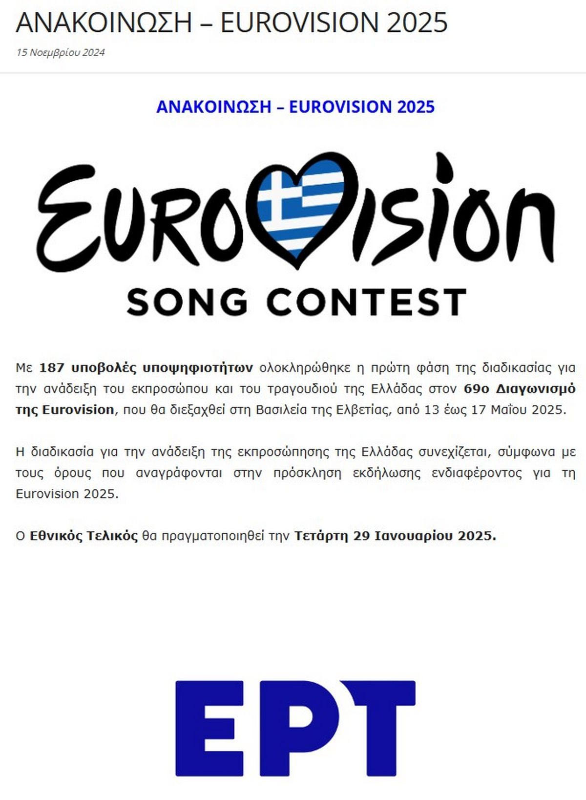 Με όχι μία, ούτε δύο αλλά 187 υποβολές υποψηφιοτήτων ολοκληρώθηκε πριν μερικές ημέρες η πρώτη φάση της διαδικασίας για την ανάδειξη του εκπροσώπου και του τραγουδιού της Ελλάδας που θα εκπροσωπήσει τη χώρα μας στον 69ο Διαγωνισμό της Eurovision, που θα διεξαχθεί στη Βασιλεία της Ελβετίας, από 13 έως 17 Μαΐου 2025.