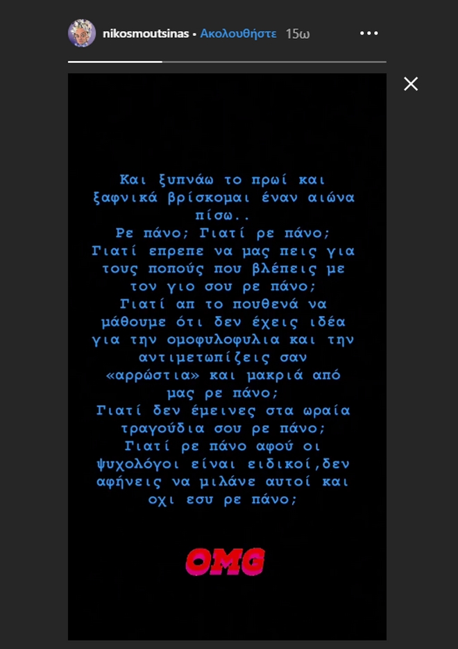 “Και ξυπνάω το πρωί και ξαφνικά βρίσκομαι έναν αιώνα πίσω..Ρε Πάνο; Γιατί ρε Πάνο; Γιατί έπρεπε να μας πεις για τους ποπούς που βλέπεις με τον γιο σου ρε Πάνο; Γιατί από το πουθενά να μάθουμε ότι δεν έχεις ιδέα για την ομοφυλοφιλία και την αντιμετωπίζεις σαν “αρρώστια” και μακριά από μας ρε Πάνο; Γιατί δεν έμεινες στα ωραία τραγούδια σου ρε Πάνο; Γιατί ρε Πάνο αφού οι ψυχολόγοι είναι ειδικοί, δεν αφήνεις να μιλάνε αυτοί και όχι εσύ ρε Πάνο;”