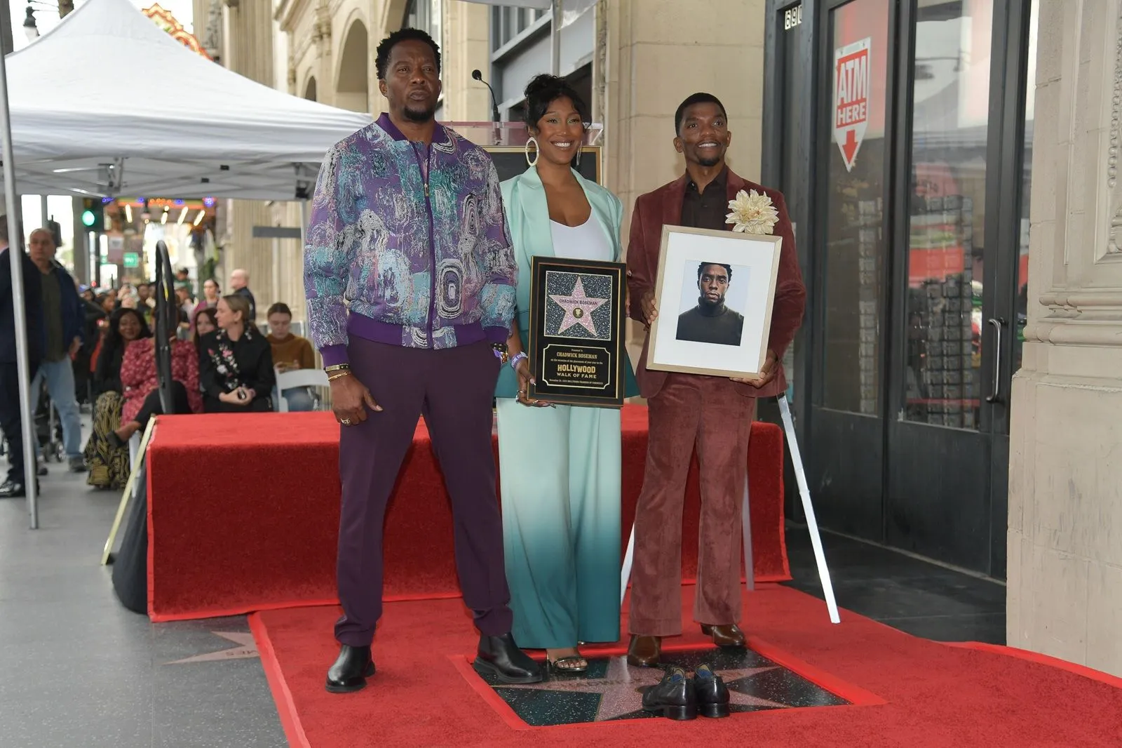 Actor Chadwick Boseman's shoes and portrait are displayed on his newly unveiled star during a posthumous Hollywood Walk of Fame ceremony on the Hollywood Walk of Fame on Thursday, Nov. 20, 2025, in Los Angeles. (Photo by Richard Shotwell/Invision/AP)