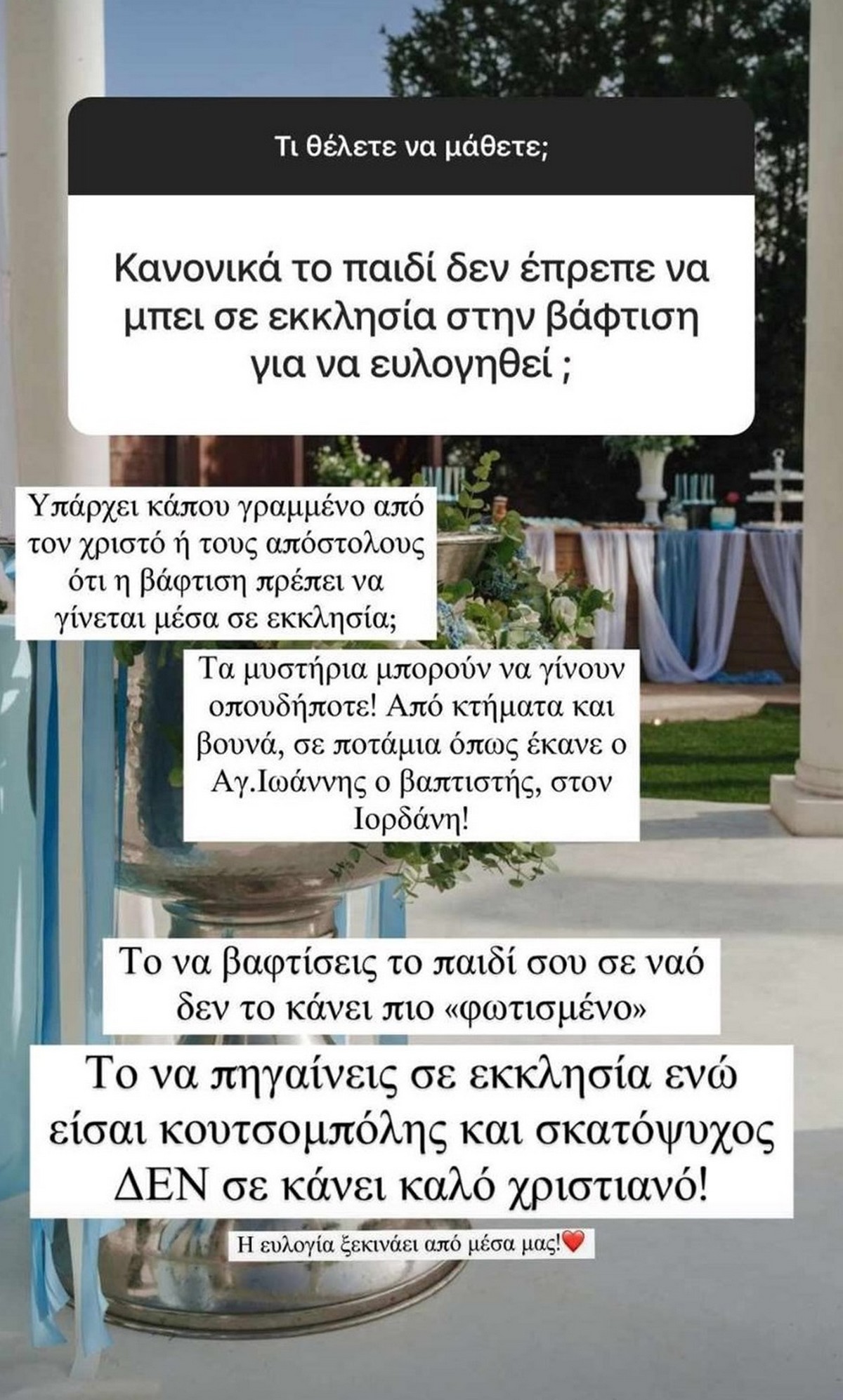 «Κανονικά το παιδί δεν θα έπρεπε να μπει σε εκκλησία στην βάφτιση για να ευλογηθεί;» ήταν η ερώτηση follower προς την Ιωάννα Τούνη, με την ίδια να απαντά αρκετά ενοχλημένη.
