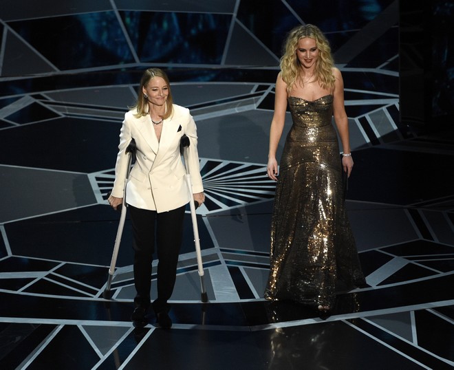 Στο κόκκινο χαλί των Όσκαρ εμφανίστηκε απαστράπτουσα όπως πάντα μέσα στο ολόχρυσο Dior σύνολό της, ενώ λίγο αργότερα παρουσίασε το Όσκαρ α΄γυναικείου ρόλου μαζί με την Τζόντι Φόστερ που περπατούσε με πατερίτσες, κάνοντας χιούμορ ότι της έβαλε “τρικλοποδιά” η… Μέριλ Στριπ.