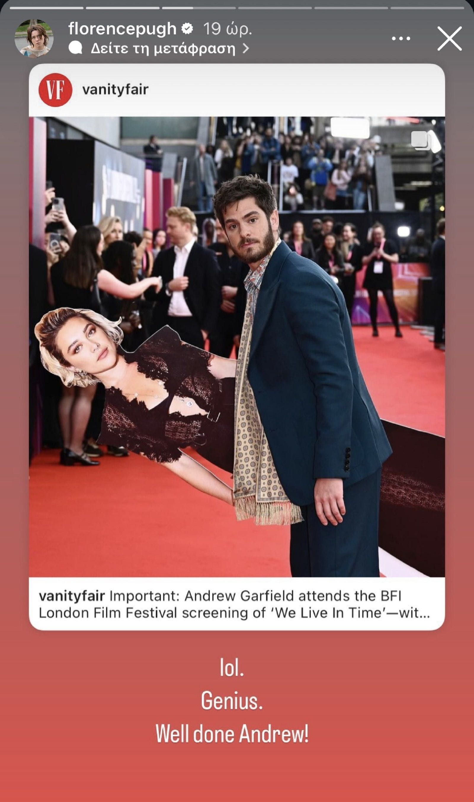 Το βράδυ της Πέμπτης (17/10), ο Βρετανός ηθοποιός Andrew Garfield έφτασε στην πρεμιέρα της νέας του ταινίας «We Live in Time» στο Φεστιβάλ Κινηματογράφου του Λονδίνου, “συνοδευόμενος” κατά κάποιον τρόπο από τη συμπρωταγωνίστριά του, Florence Pugh… H 28χρονη ηθοποιός δεν κατάφερε λόγω υποχρεώσεων να δώσει το παρών, αυτό όμως δεν απέτρεψε τον Garfiled από το να “φωτογραφηθεί” μαζί της: Έφερε μαζί του ένα χάρτινο ομοίωμα της Pugh, το αγκάλιασε και χαμογέλασε μπροστά στους φωτογράφους, προκαλώντας “φρενίτιδα” στα social.