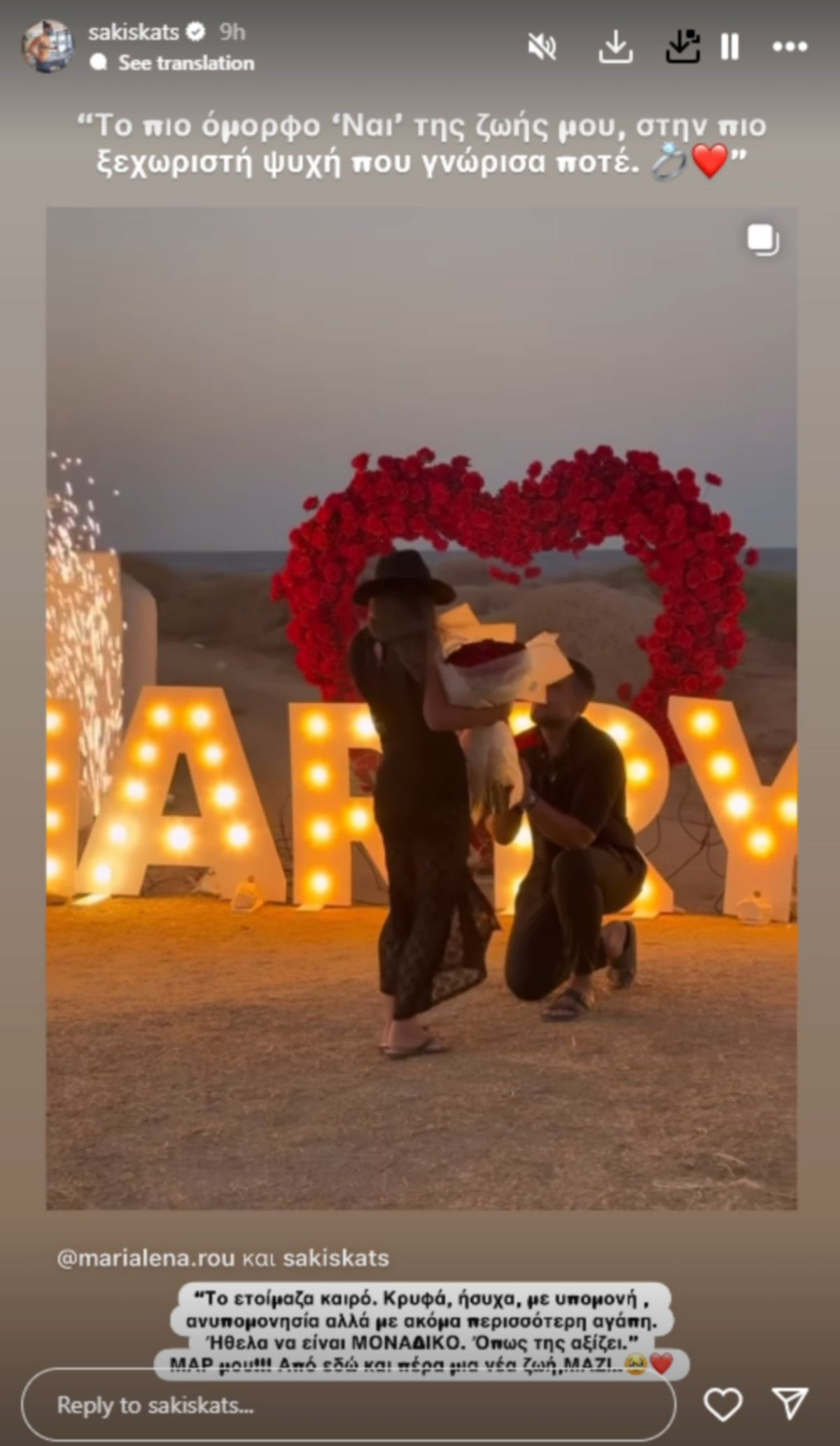 Σε ανάρτηση που έκανε ο Σάκης Κατσούλης, ανέφερε πως το “ναι” της Μαριαλένας Ρουμελιώτη ήταν το πιο όμορφο της ζωής του, ενώ αποκάλυψε πως ήταν κάτι που ετοίμαζε κρυφά και ήσυχα εδώ και καιρό, θέλοντας να είναι μία μοναδική στιγμή.