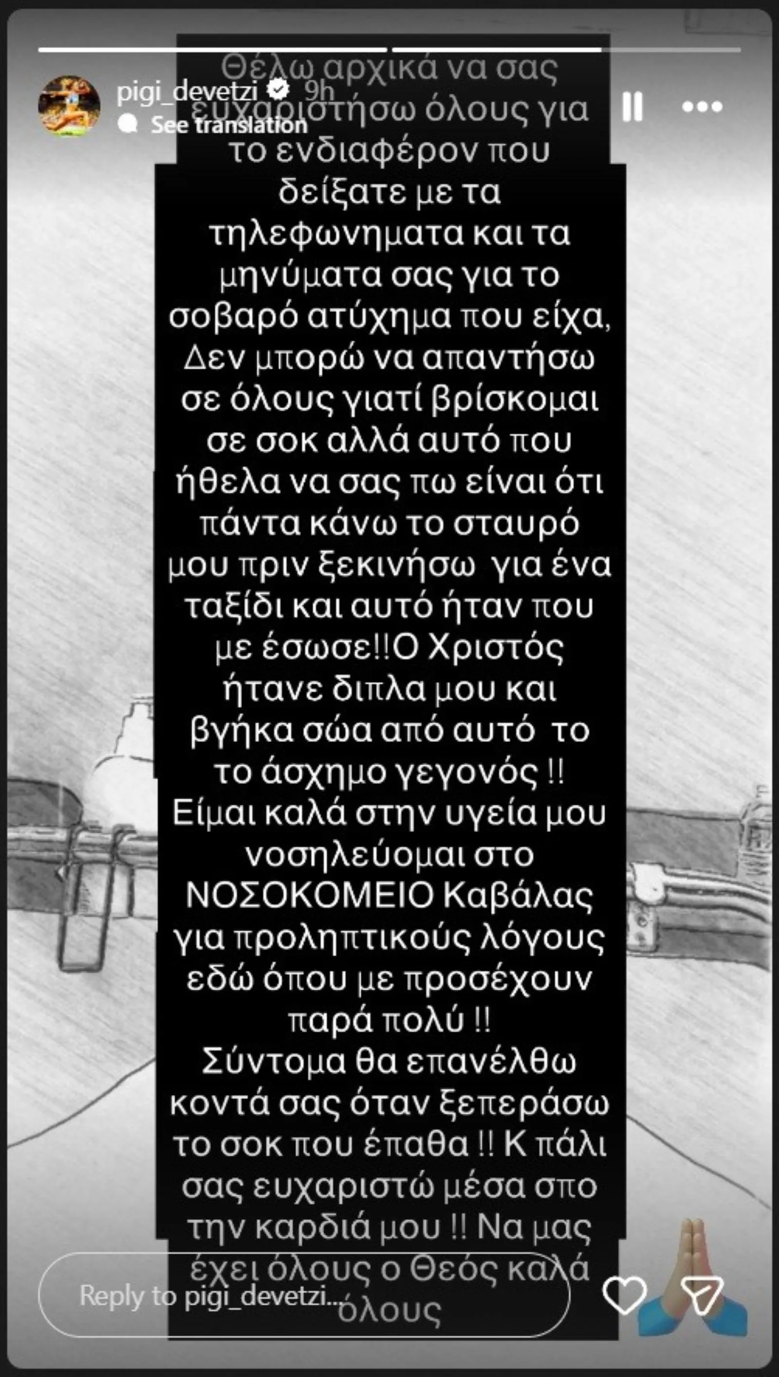 Σύντομα θα επανέλθω κοντά σας όταν ξεπεράσω το σοκ που έπαθα!! Κ πάλι σας ευχαριστώ μέσα από την καρδιά μου!! Να μας έχει όλους ο Θεός καλά».