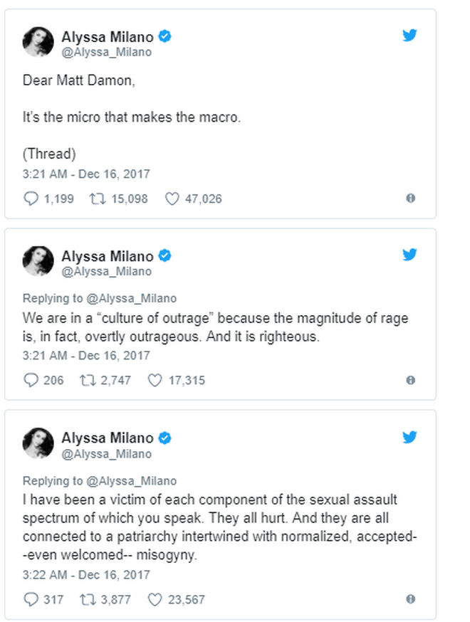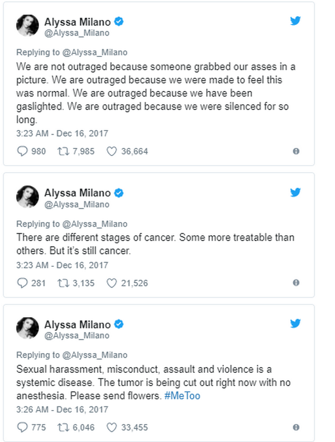 “Έχω πέσει θύμα σεξουαλικών επιθέσεων όλου του φάσματος που ανέφερες. Όλες είναι επώδυνες.[…] Αυτό που μας εξοργίζει είναι ότι αναγκαζόμαστε να θεωρούμε ότι αυτό είναι φυσιολογικό.[…] Αυτό που μας εξοργίζει είναι ότι ήμαστε σιωπηλές για πάρα πολύ καιρό. […] Υπάρχουν πολλά στάδια στον καρκίνο. Κάποια είναι πιο θεραπεύσιμα, όμως και πάλι είναι καρκίνος. Η σεξουαλική παρενόχληση, η σεξουαλική επίθεση και η σεξουαλική βία είναι συστημική ασθένεια. Ο όγκος αποκόπτεται τώρα και χωρίς αναισθησία”, αναφέρει στα tweets της η ηθοποιός.