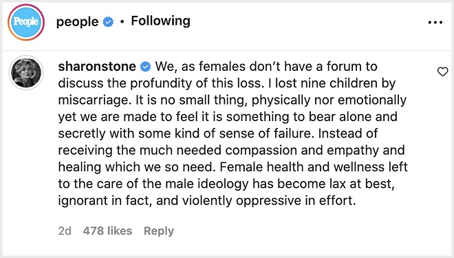 Το αποκαλυπτικό σχόλιο της Σάρον Στόουν για τις εννέα αποβολές που βίωσε, τα σκληρά συναισθήματα που προκύπτουν, αλλά και την ανυπαρξία φορέων, ώστε να μπορέσουν να μιλήσουν ανοικτά.