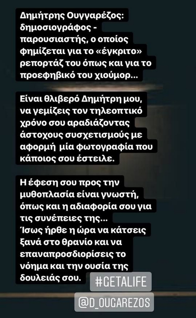 «Η έφεσή σου προς την μυθοπλασία είναι γνωστή, όπως και η αδιαφορία σου για τις συνέπειές της. Ίσως ήρθε η ώρα να κάτσεις ξανά στο θρανίο και να επαναπροσδιορίσεις το νόημα και την ουσία της δουλειάς σου» έκλεινε στην ανάρτησή της η παρουσιάστρια, προσθέτοντας το Hashtag #GetALife και αναφέροντας το προφίλ του Ουγγαρέζου στο instagram.